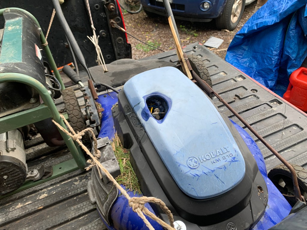 Then got out the mower and mowed in front of the Ahi property and started along the road. The wire came loose from the terminal inside again, so I put it back in place and used some electrical tape to hold it in place. Big mistake.
