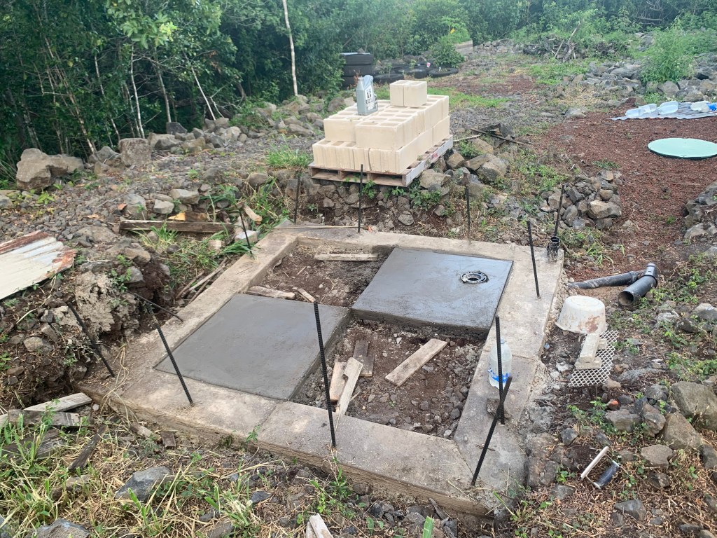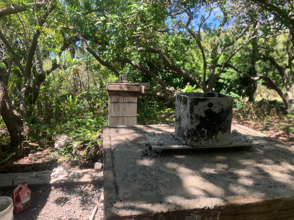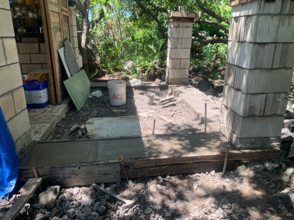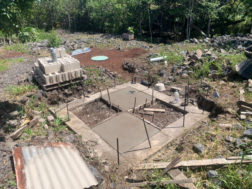 In the morning, after breakfast, I mixed concrete and poured two of the squares in the bathroom floor.