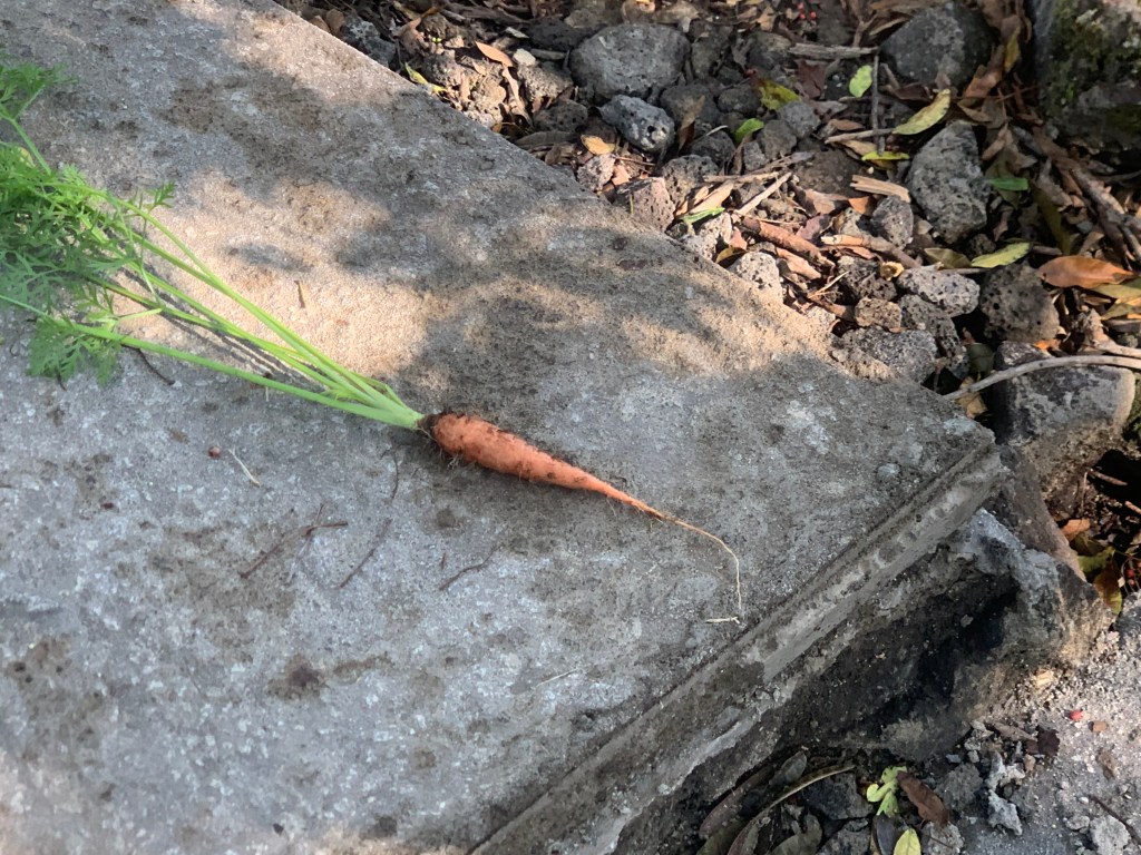 I pulled one of the carrots from my raised garden! It even tasted like a carrot, This carrot has been growing since the last time I was here – that is over two months!