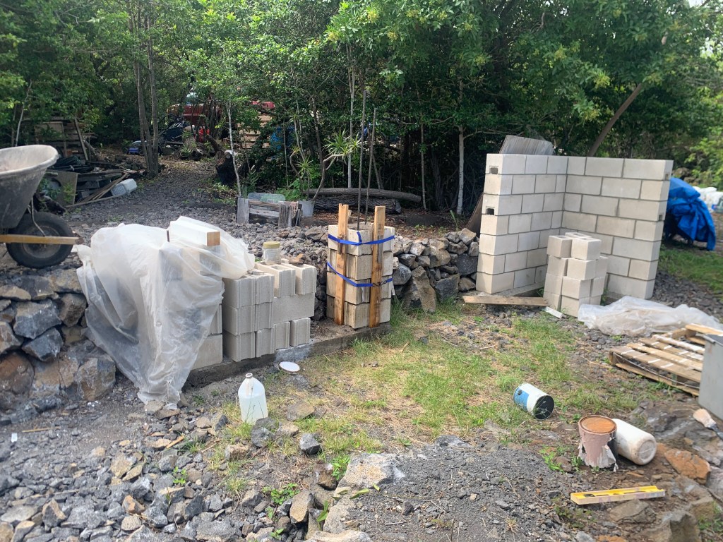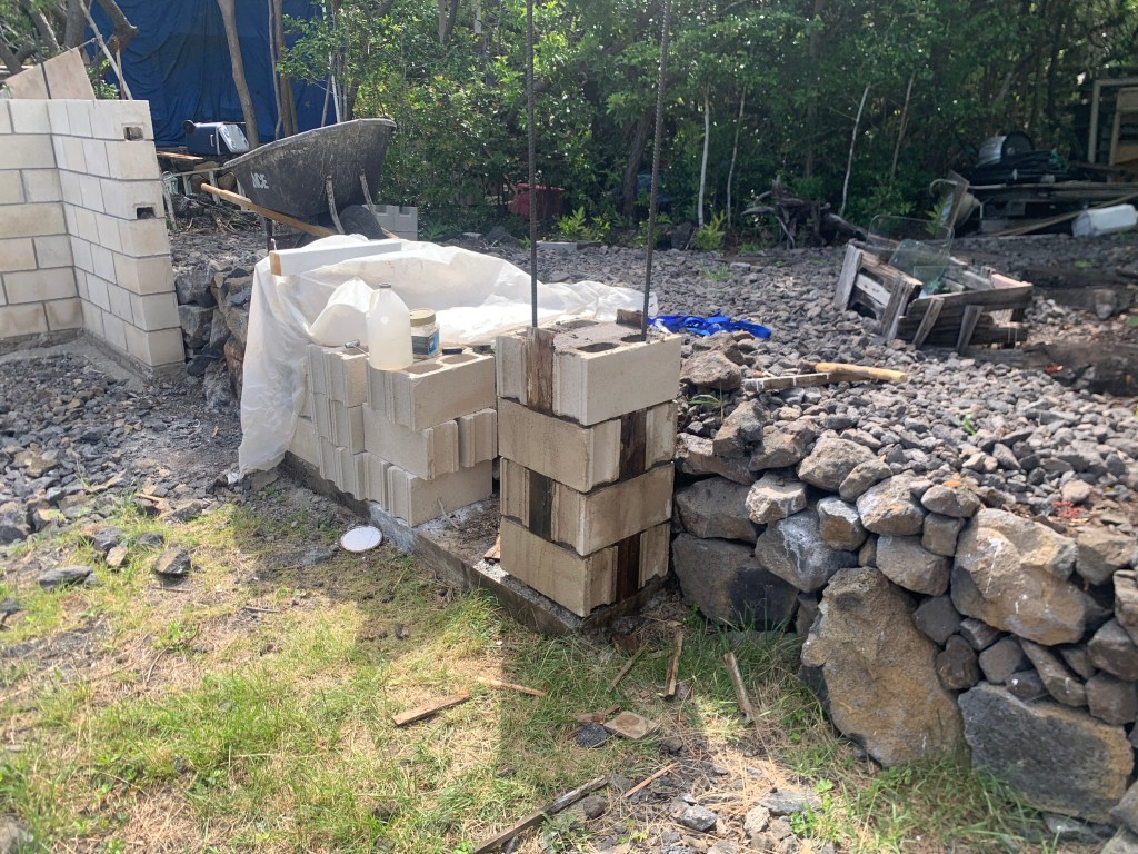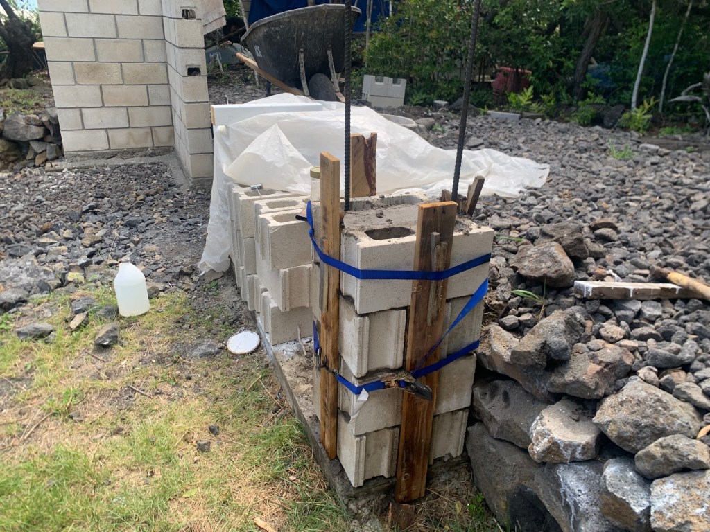 Using the excess concrete from pouring the compass rose, I grouted one of the columns for the house. The black color will contrast with the gray color of the block, should I choose not to paint the columns.
