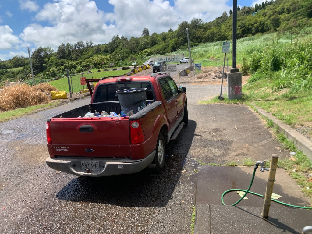After breakfast of pancakes, I loaded the truck with my empty water bottles and went to the water station in Waiohinu! While I was filling my bottles, others came with larger containers such as the 250 gallon cubes, loaded on a trailer or in the back of a pickup truck. They were able to collect 250 gallons in half the time it took me to get around 60 gallons in my individual bottles!