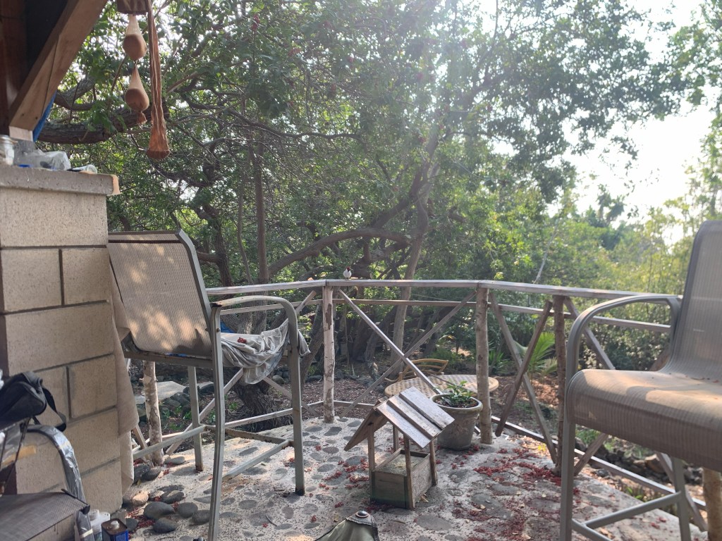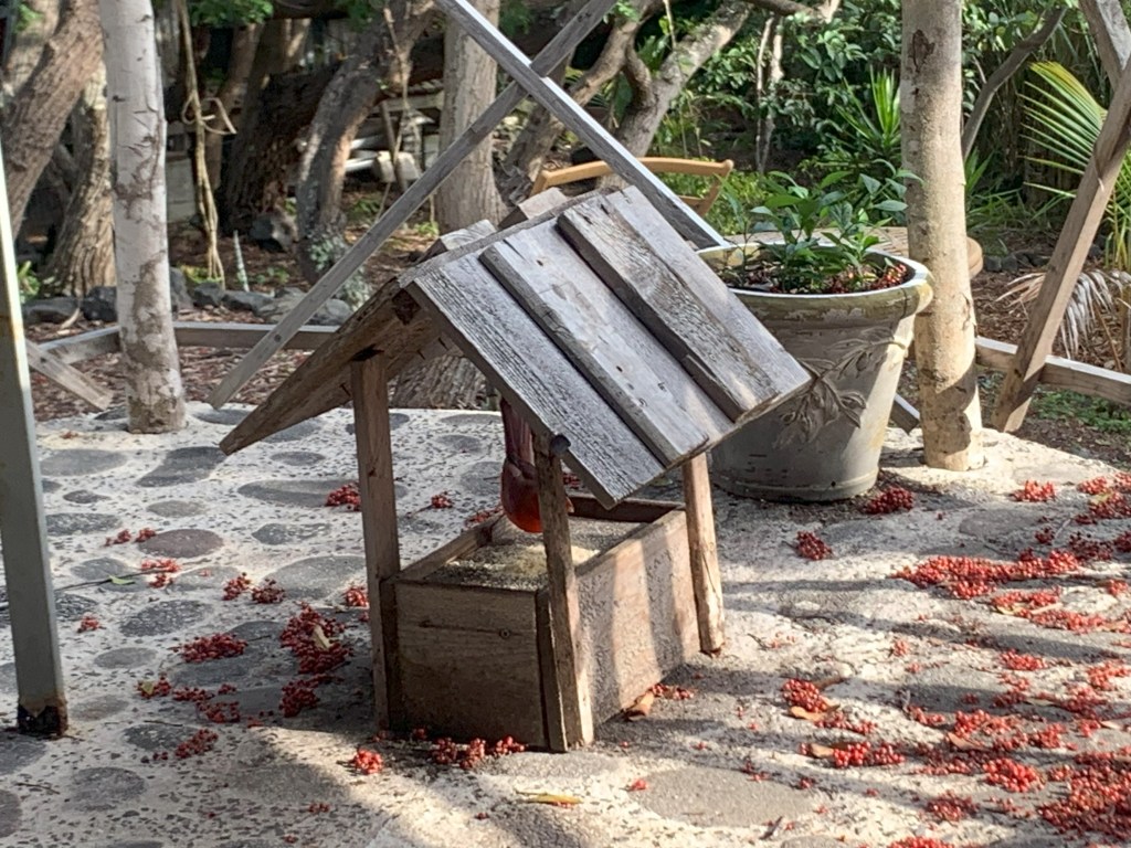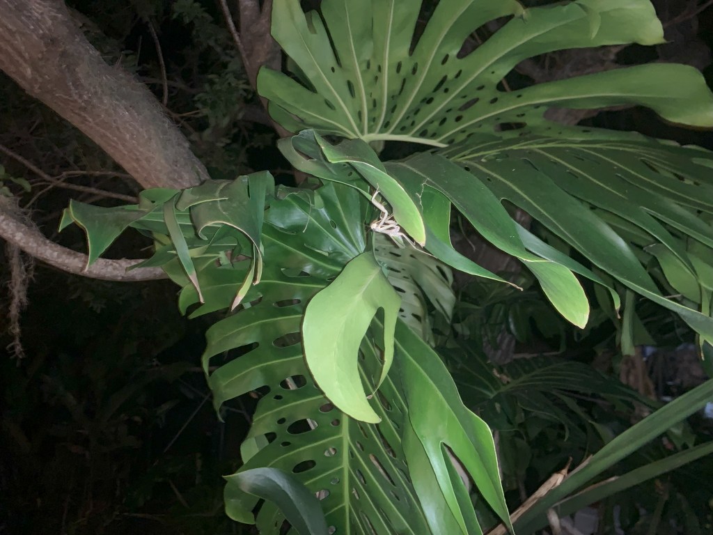 Scott has a wooden hot tub that is wood fired. It is just large enough for one person, and he invited me over to soak in it. As we sat there talking, a praying mantis flew down from the trees above and landed on a monstera plant. He must have though it was his turn in the tub!