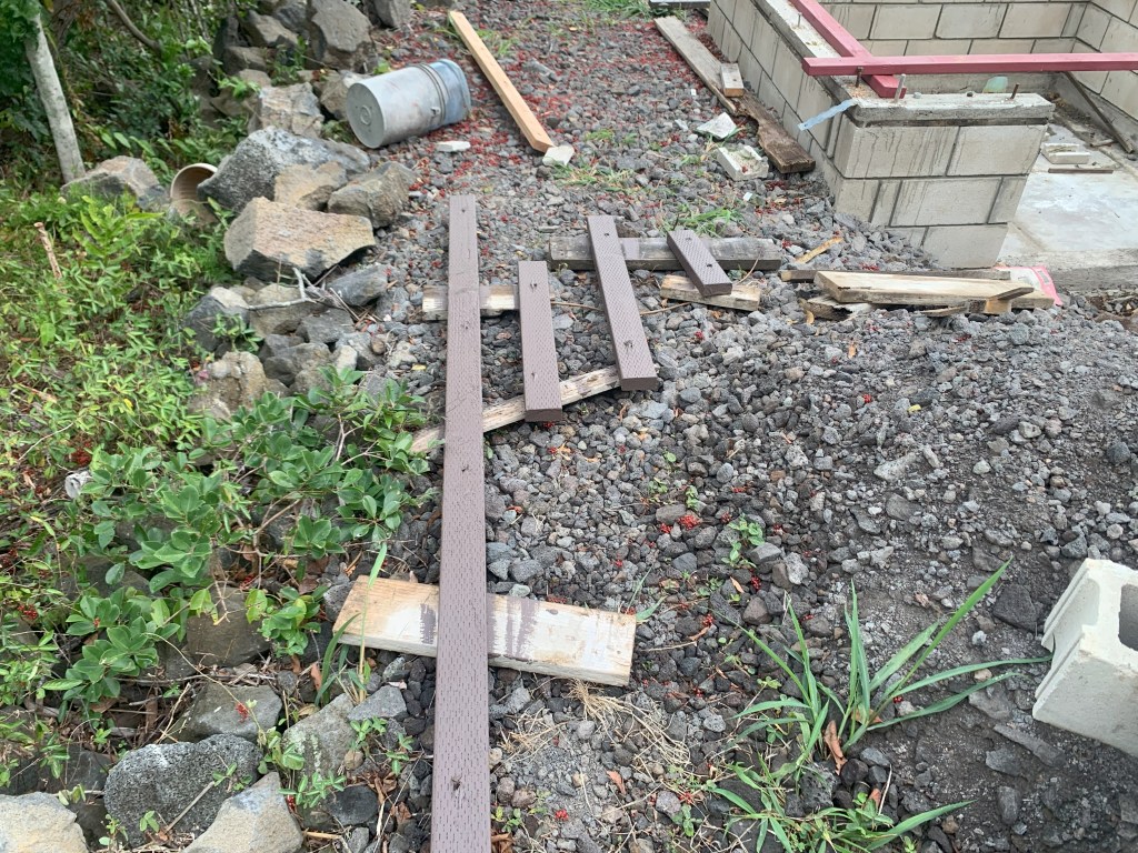 When I was here in December, I had asked my neighbor Brian to pick up some specially treated 2 x 4’s for the bottom plates of my bathroom walls. He had stacked them inside the gate.