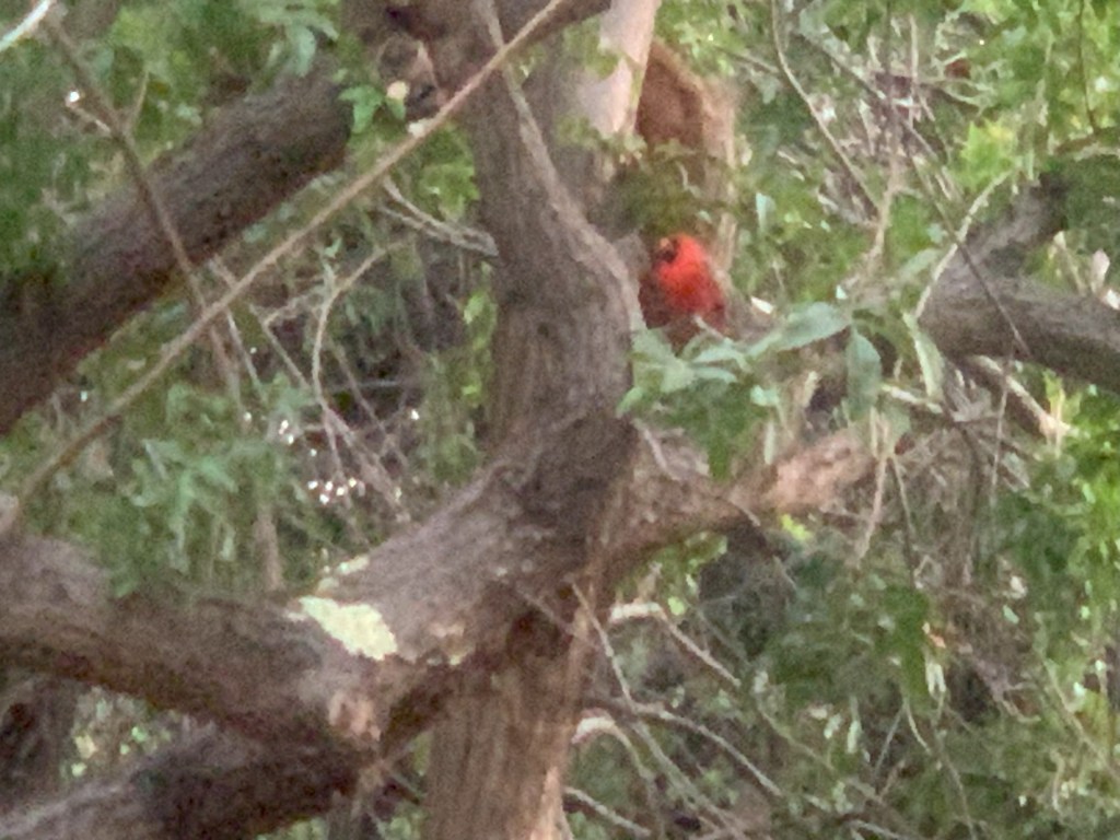A northern red cardinal sits in a tree overlooking the feeder – waiting his turn!