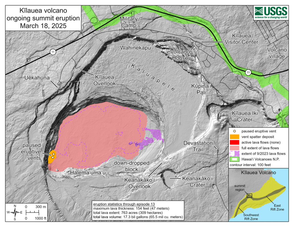This map above shows the caldera of Kilauea within the National Park, with the current lava flow area shown in pink, and the eruptive vents on the south wall shown in yellow.