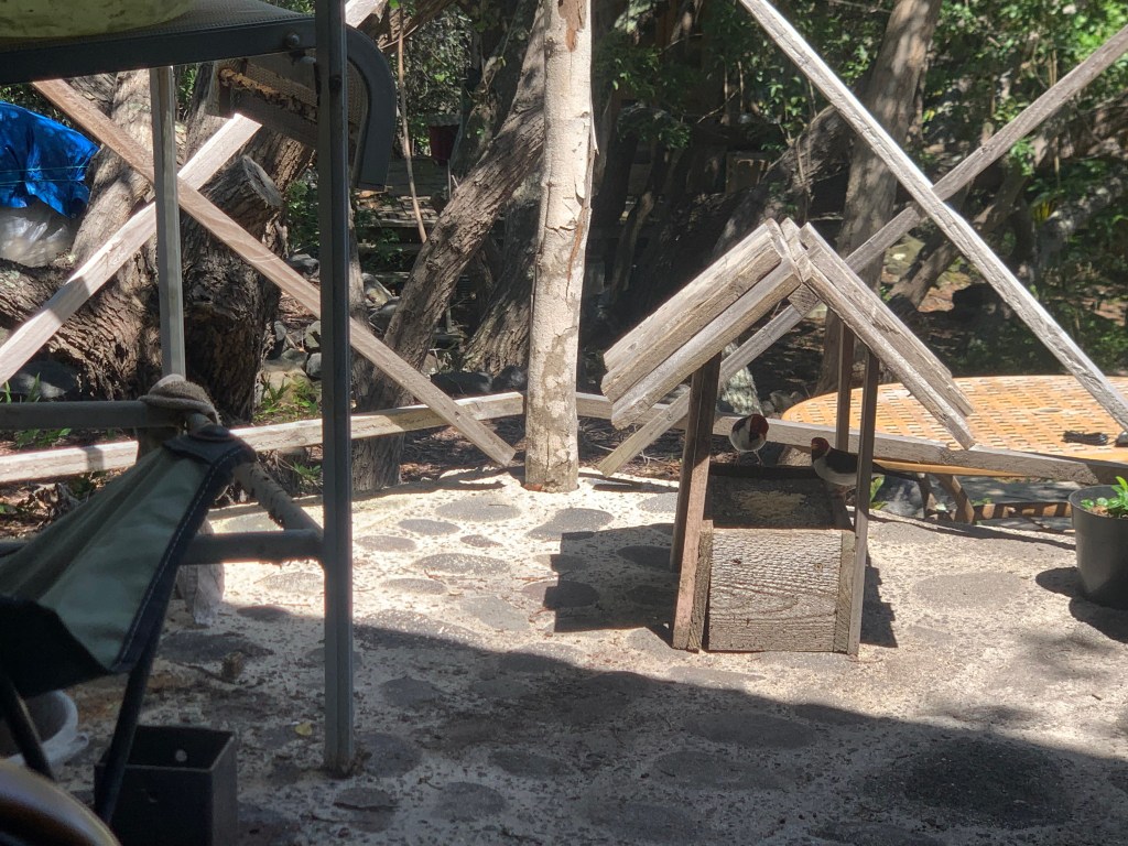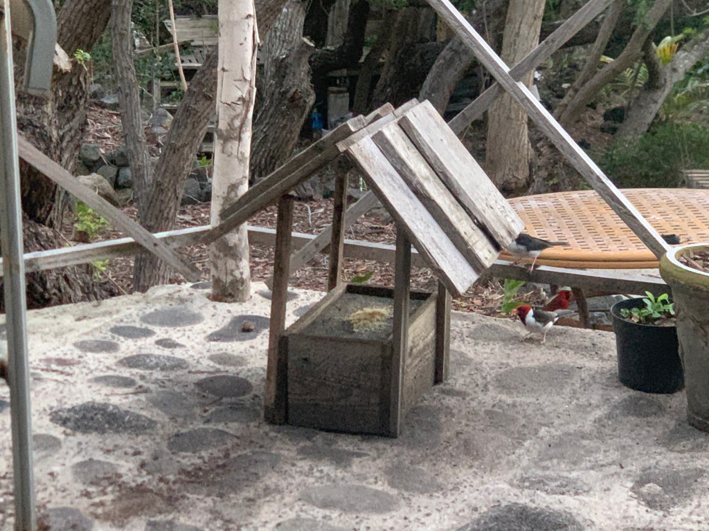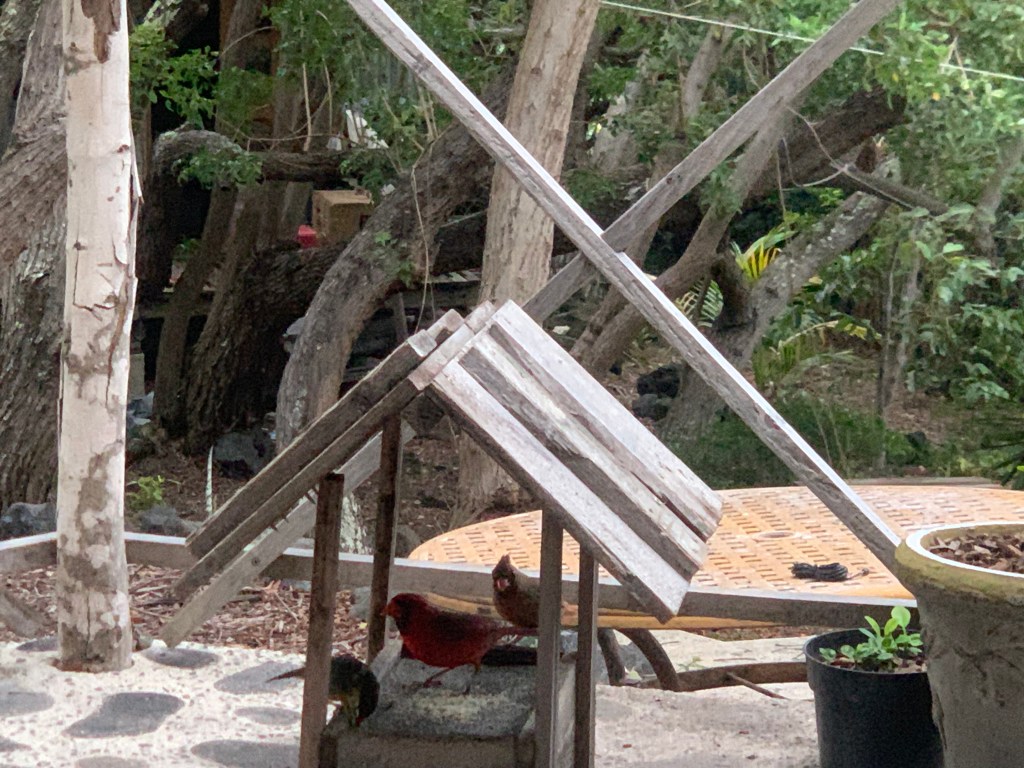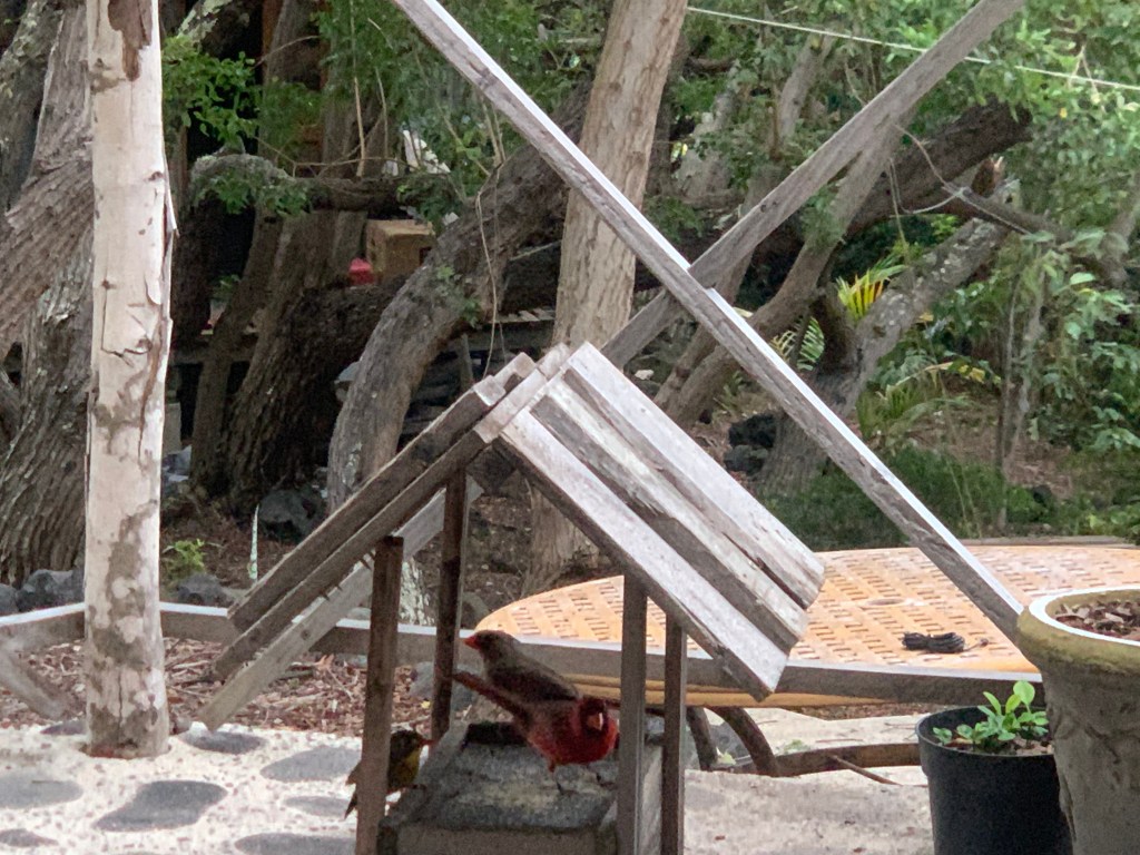 When the honeycreepers chased them away from the feeder. the two red headed cardinals hung out in the trees above the lanai, waiting for their turn.