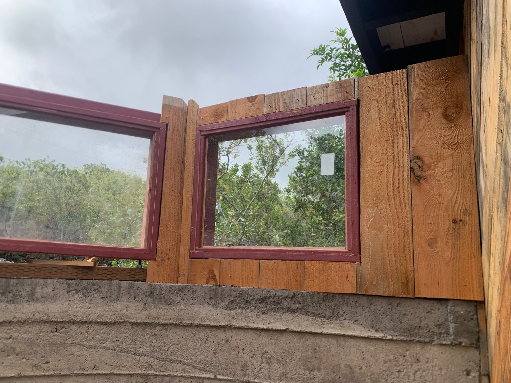 Once the windows were in place, I began with some board siding to complete the upper frame walls. I used some 1 x 6 cedar fence boards as the siding.
