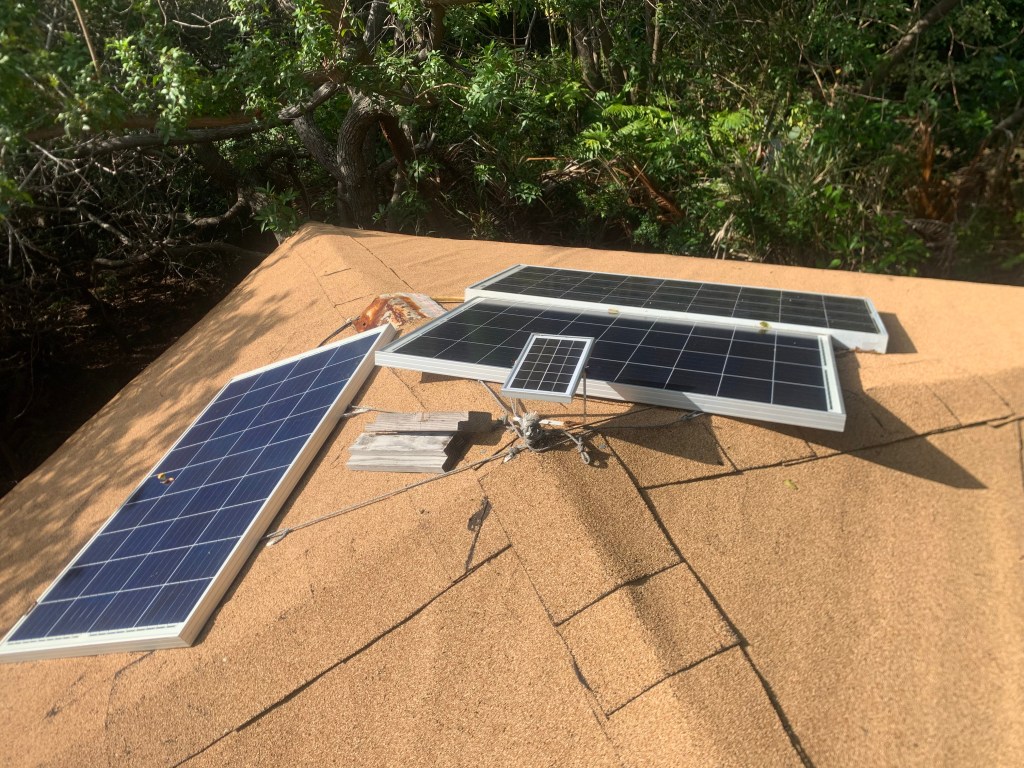 The first order of business this morning was to set up the solar panels and get the refrigerator going. The batteries have enough electricity for the lights over night, but we will need to recharge them to continue.