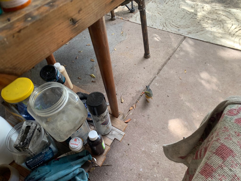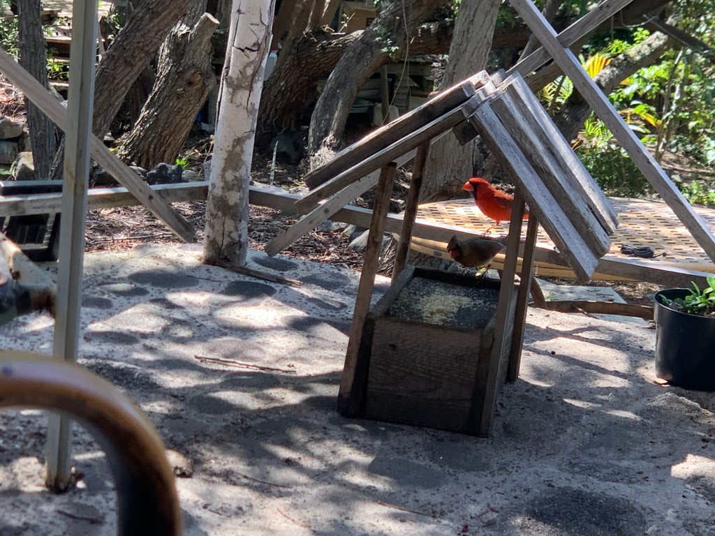 But first, I have to feed the birds. I put the cracker crumbs in the feeder, but they can’t seem to decide who will venture forth first!