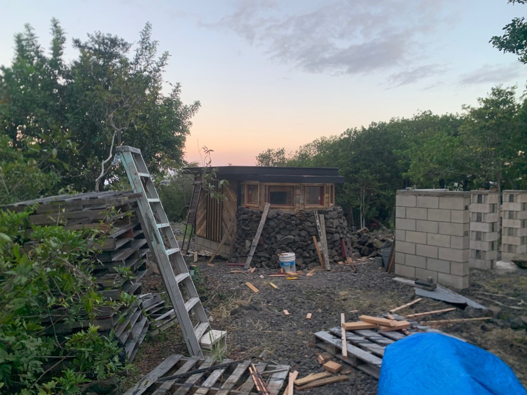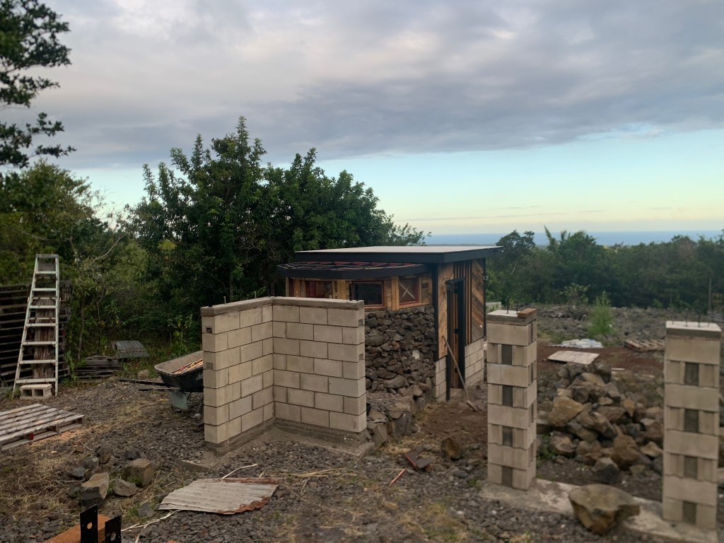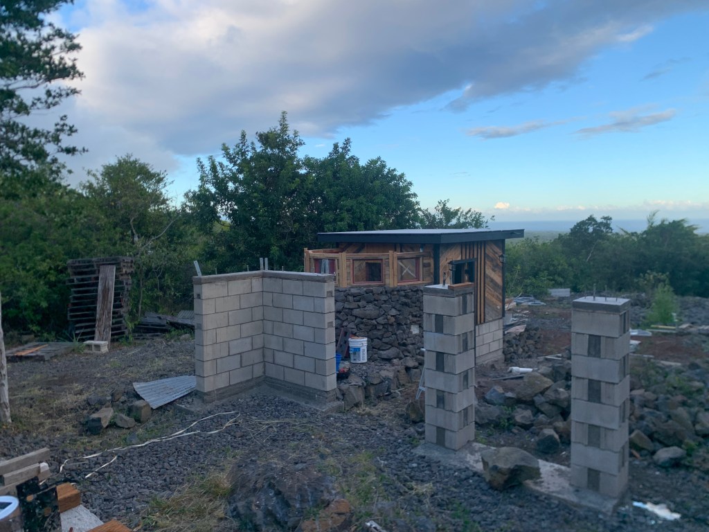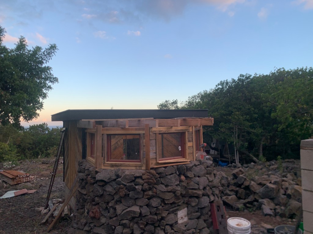 I installed some used roofing on the shower. I’ll wire brush this and then paint it with elastomeric roof coating.