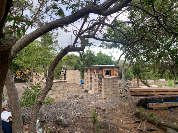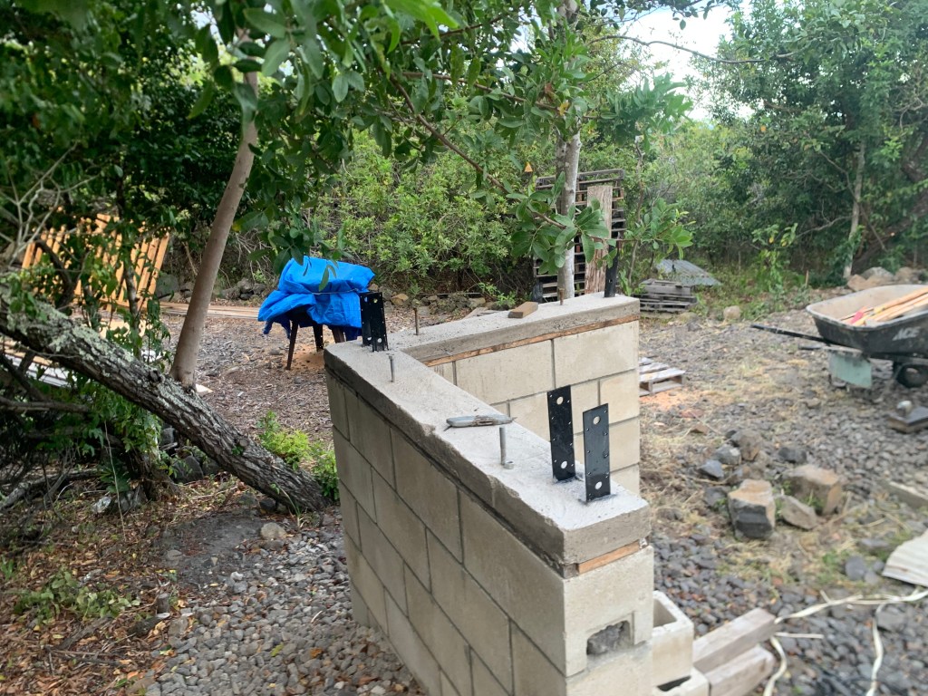 I painted the metal supports/straps on top of the masonry walls for the house in preparation for installing the posts and beams.