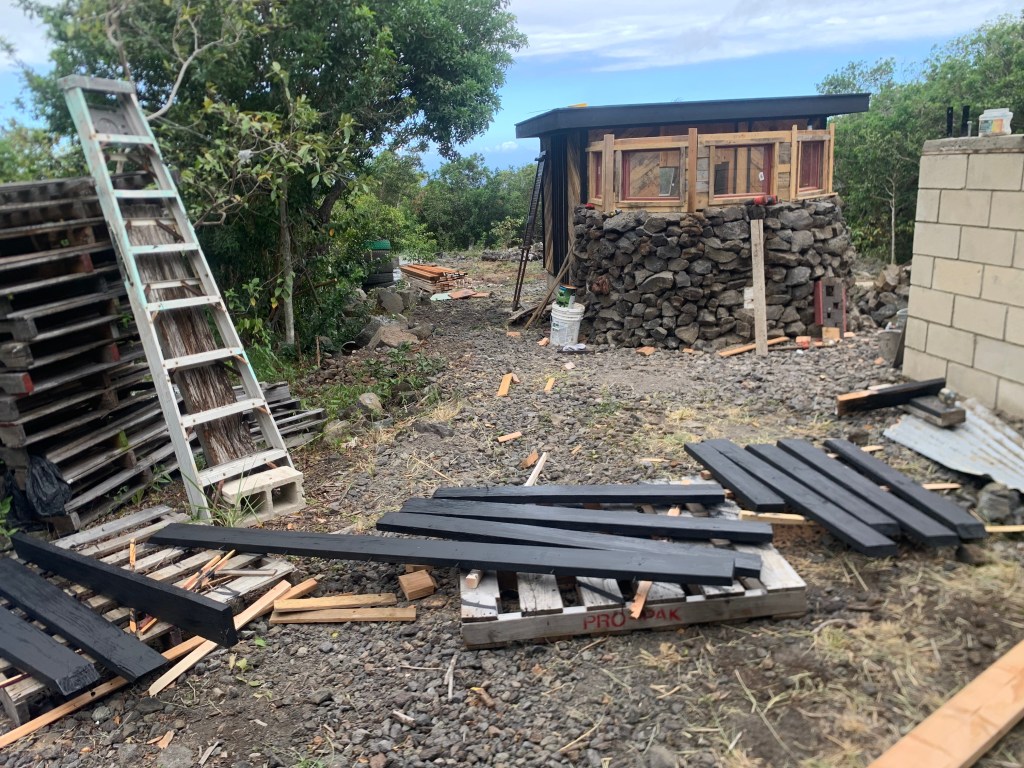 I took apart the roof structure over the shower that I had built yesterday, and painted all the parts.