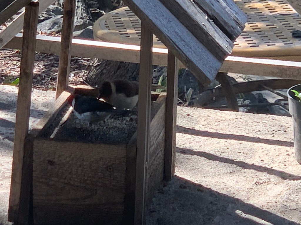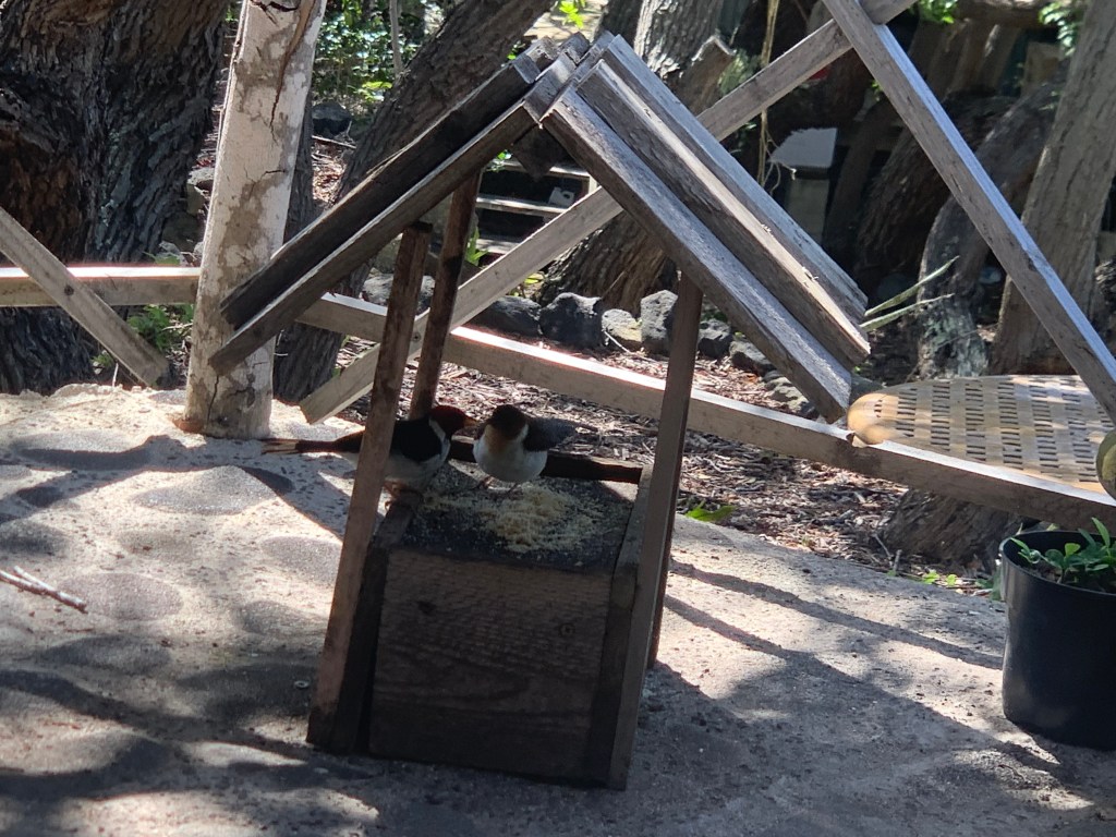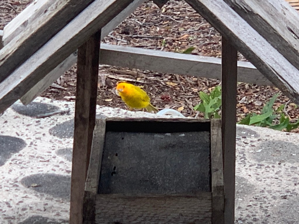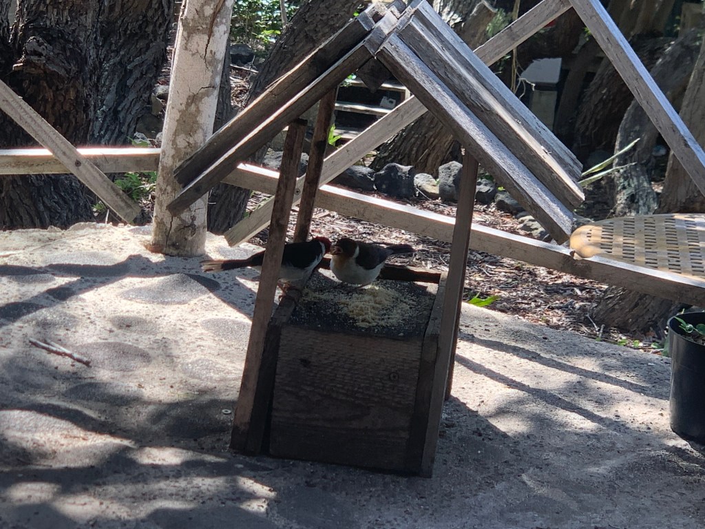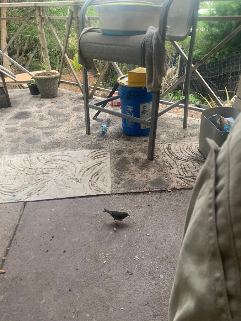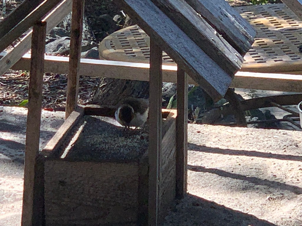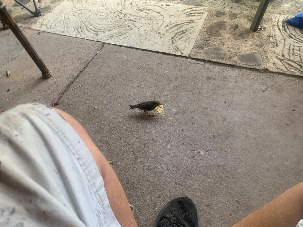 Little Charlie, the bold honey creeper is becoming bolder, with his venturing further into the gazebo while I am there.