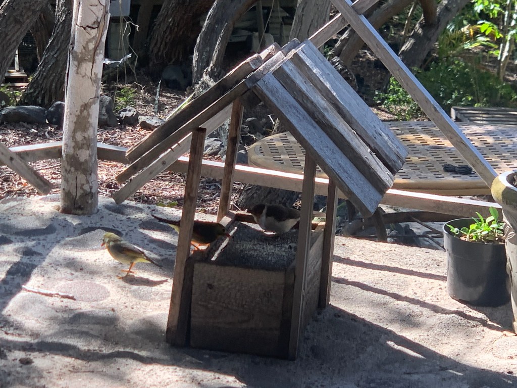 I watch them as the young hang out in the branches of the trees above the lanai as the parents shuttle back and forth from the feeder to gather a beakful and then deliver it to the chicks. As they get a few days older, the young venture down to the handrail around the lanai, and eventually down to the feeder itself.