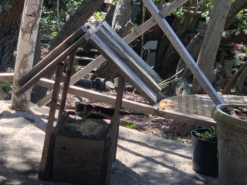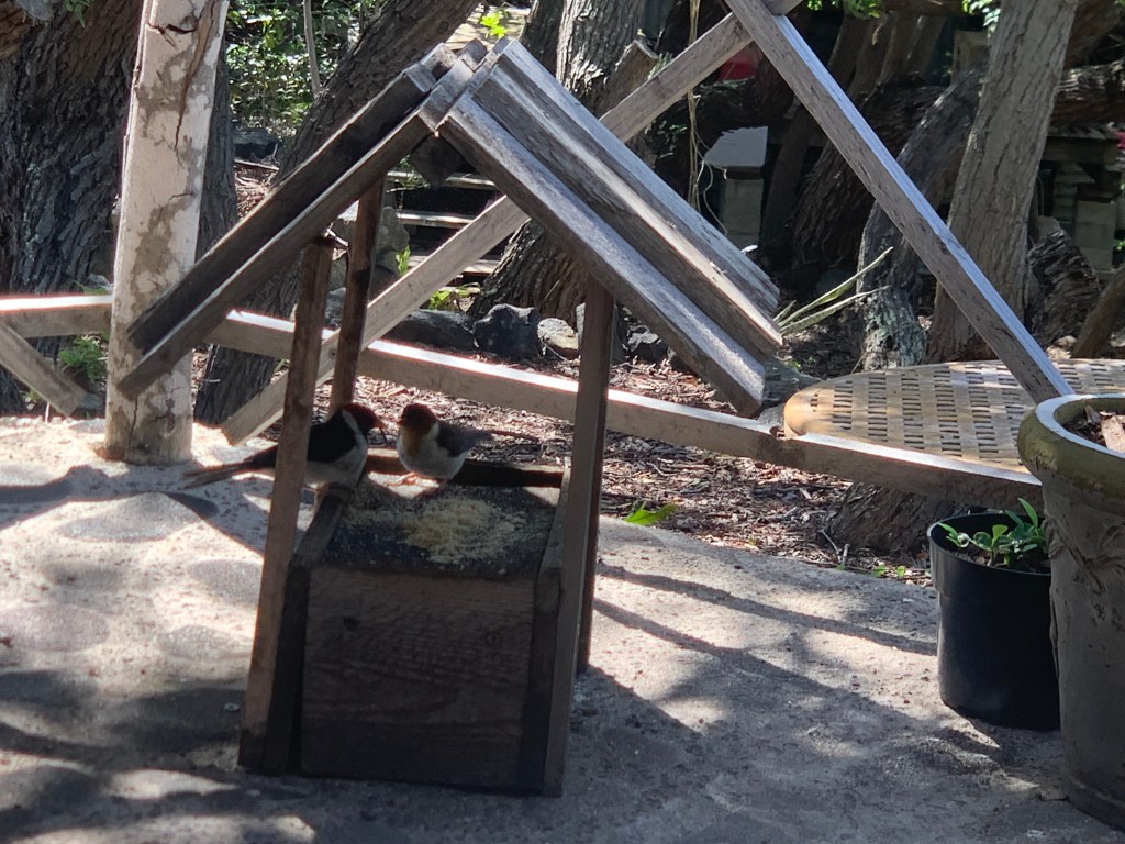 They make use of the tiered water fointain at the edge of the lanai as well as grab a bit from the feeder.