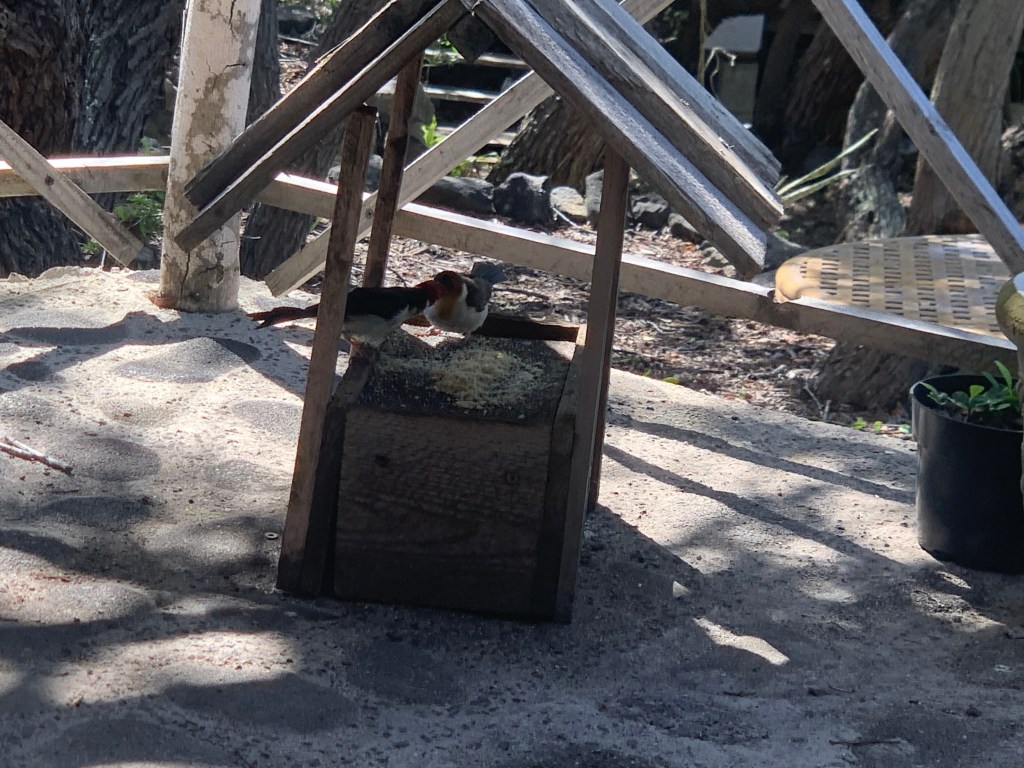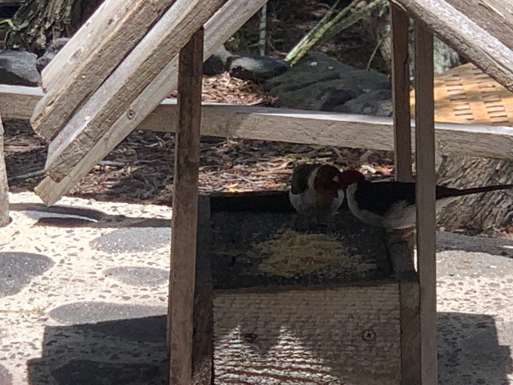 The red headed cardinals are not as bold as the honey creepers. They come close, but they will not come near my shoes.