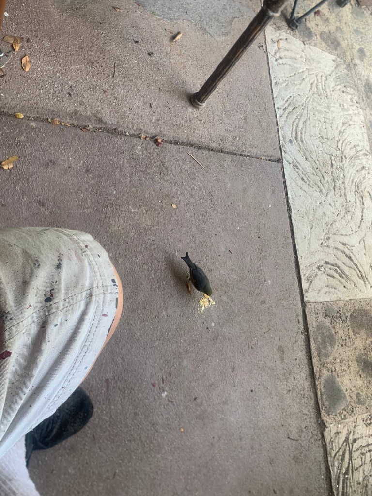 All the other birds stay out on the lanai, as if there is an invisible barrier at the edge of the roof extending down to the floor. When I am sitting, standing, cooking, etc., in the gazebo, they come up to this invisible barrier, but no further. When I am not in the gazebo, I have seen them in there on the chairs and the table, but when I am there, they keep this small distance between us. Except for this one little bird!