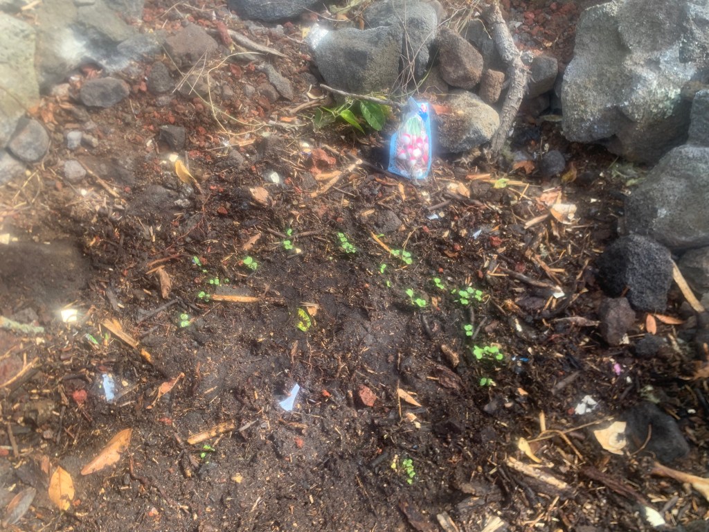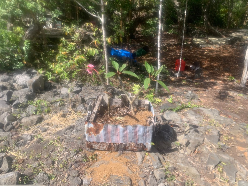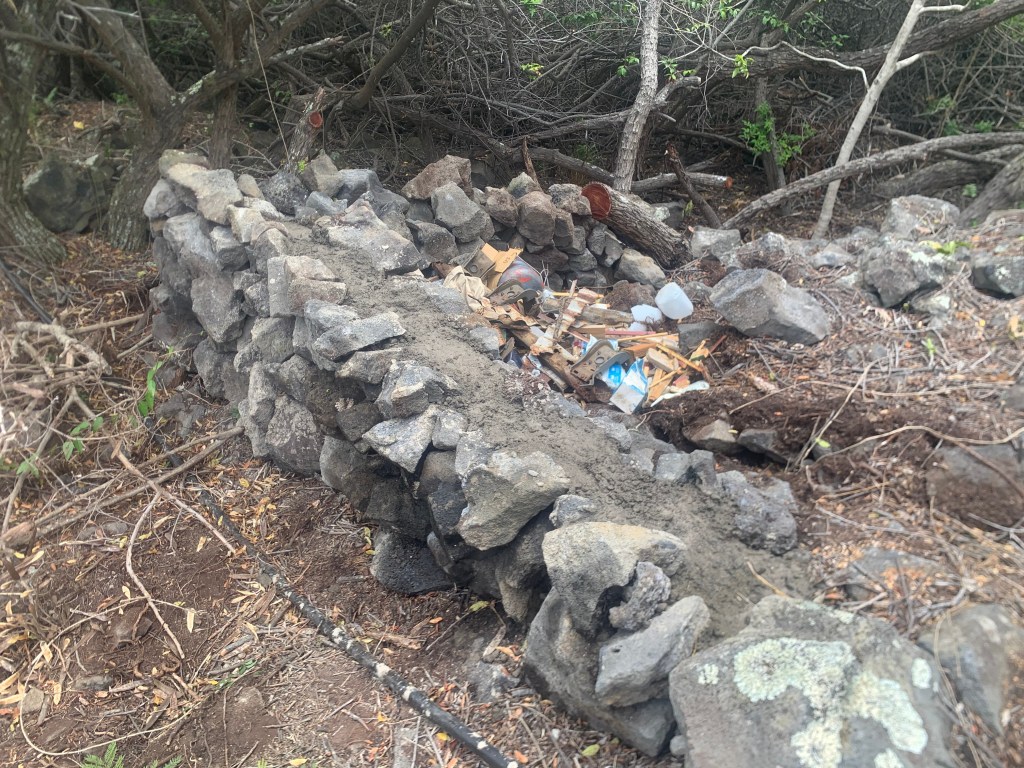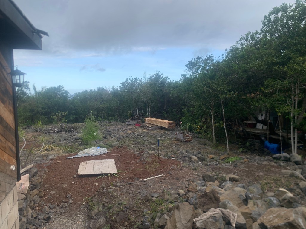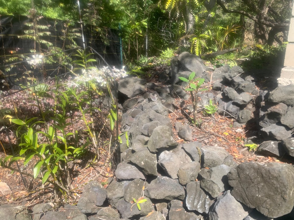 At the far northeast end of the properties directly on Holowai, I have built a rock wall to identify this corner. In doing so, I have created a sort of a hollow area behind the wall that will need to be filled. I have begun filling it with my garbage that I do not put in the compost bin. Bulk material that I will eventually cover with wood chips and compost. Possibly not an approved process, but . . . so it goes!