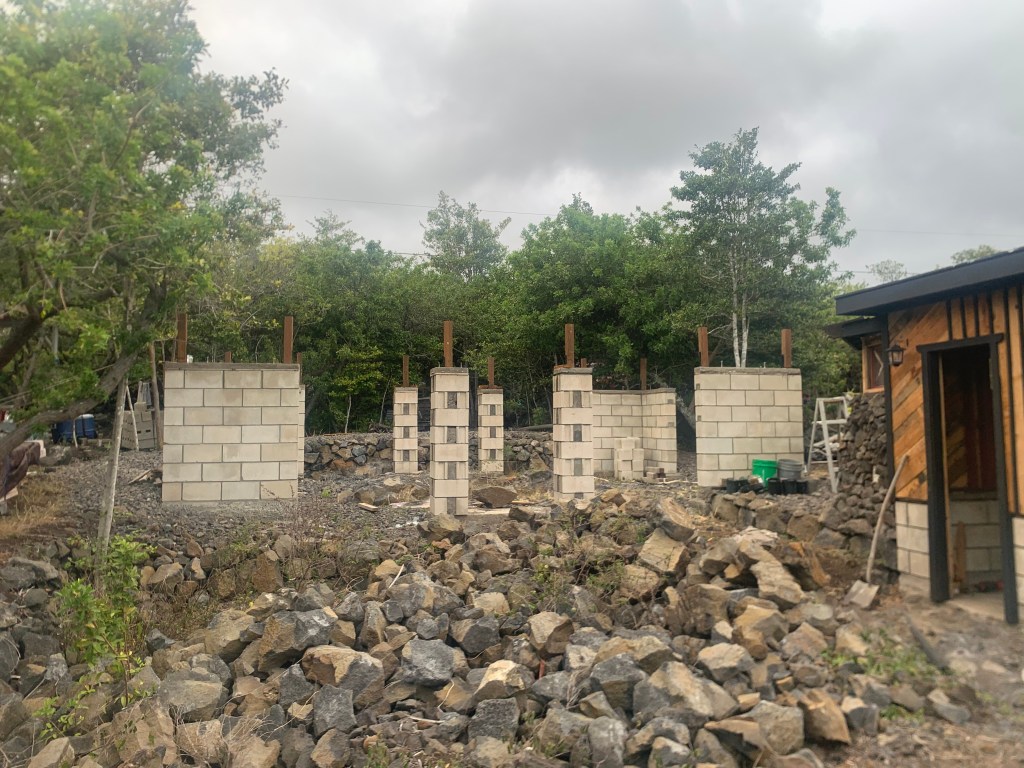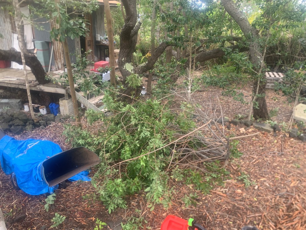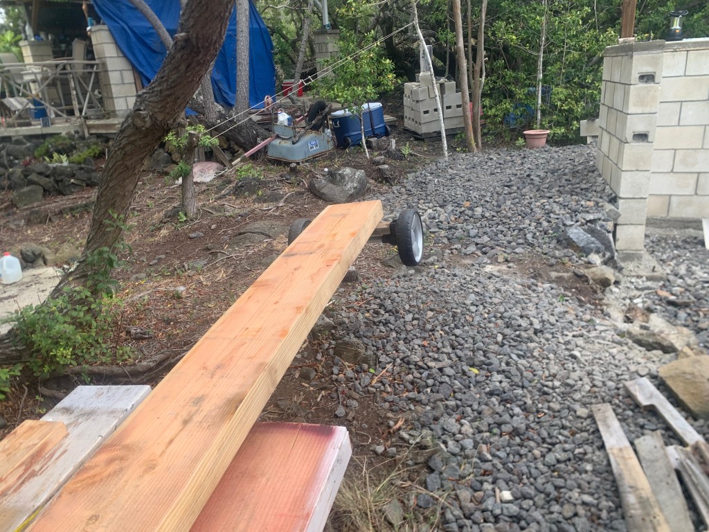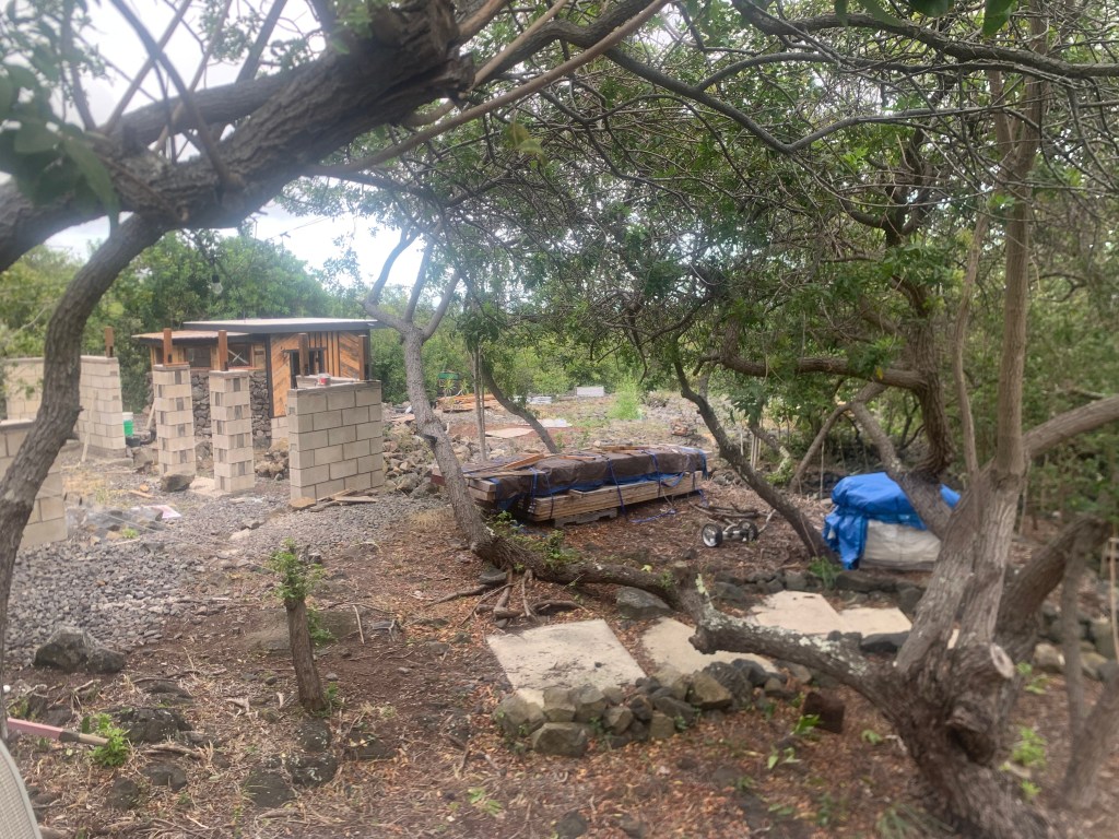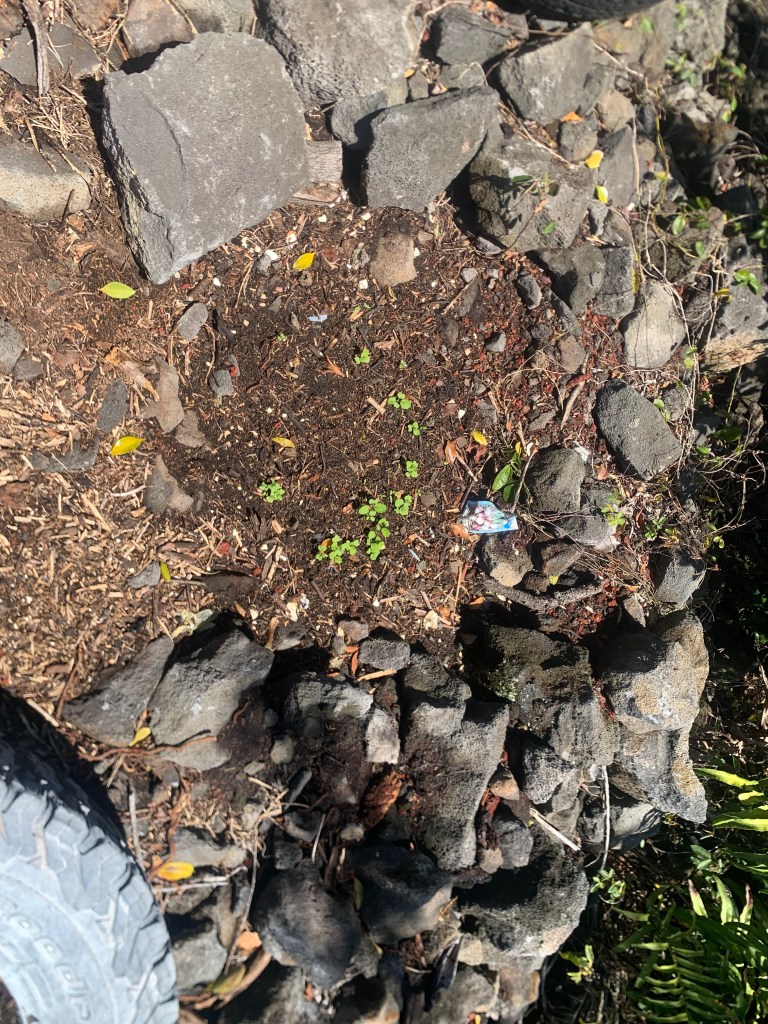 At the far northeast end of the properties directly on Holowai, I have built a rock wall to identify this corner. In doing so, I have created a sort of a hollow area behind the wall that will need to be filled. I have begun filling it with my garbage that I do not put in the compost bin. Bulk material that I will eventually cover with wood chips and compost. Possibly not an approved process, but . . . so it goes!
