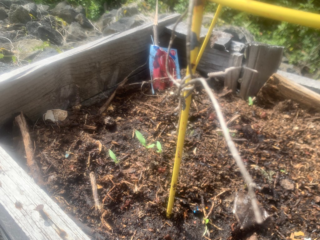 There are lots of small tomato plants coming up in the tomato planter!