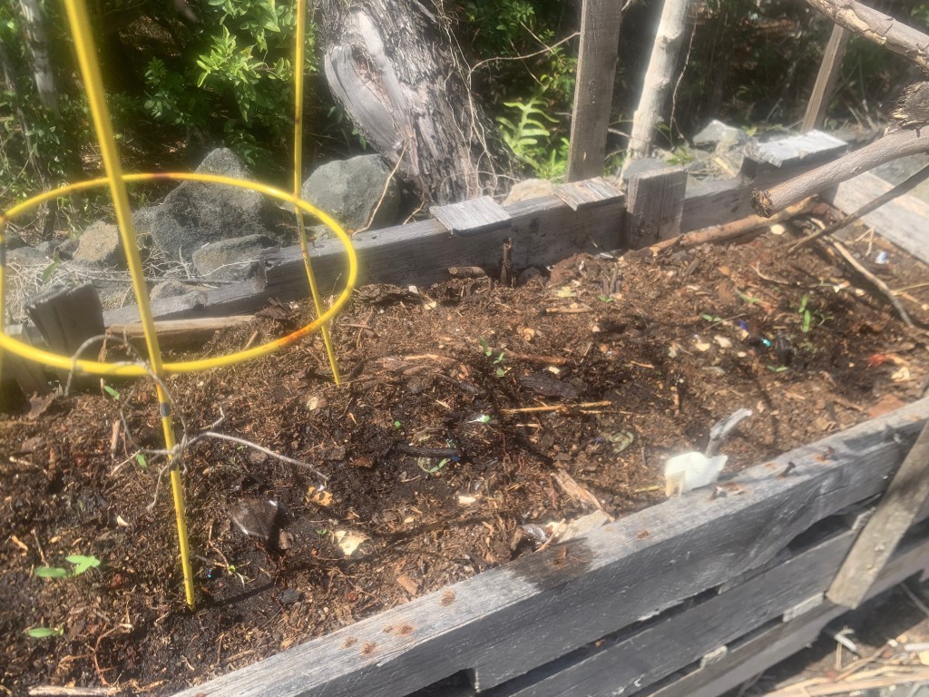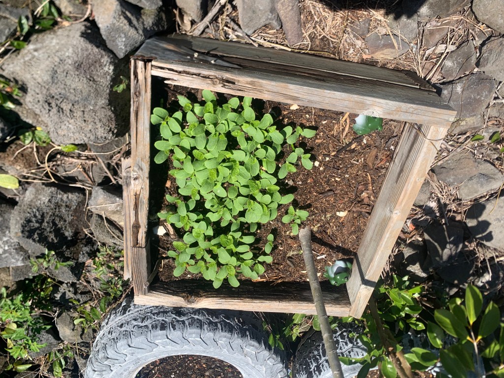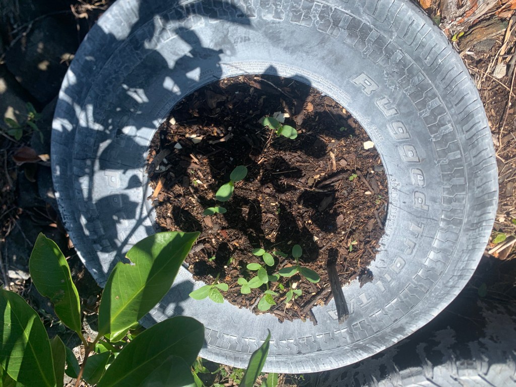 When Alanah was here, she planted some seeds. Tomatoes in the tomato planter box, turnips where the compost pile had been (I moved it to mix the contents), squash seeds in the planter where the single papaya is growing and in a couple of the tires.