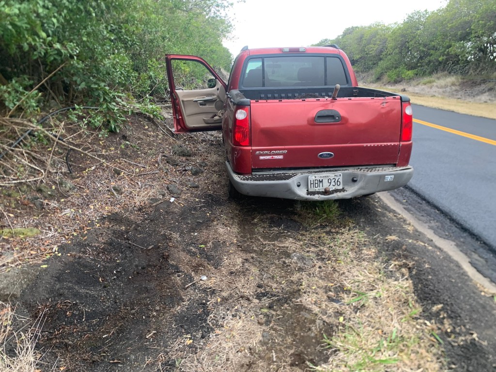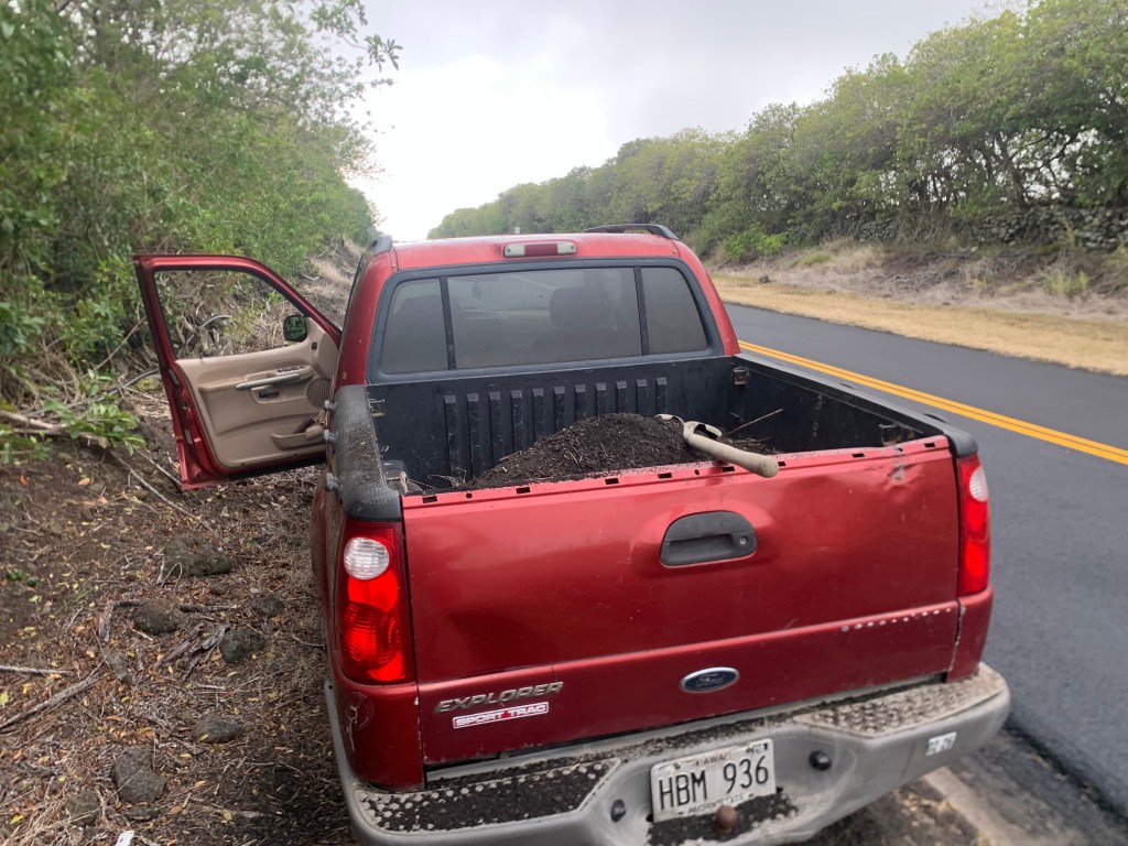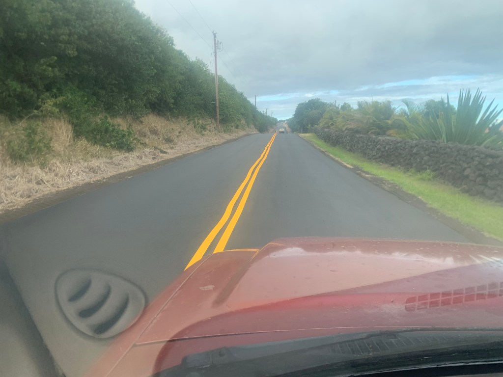 As they repave Kama’oa road, the highway department is leaving small piles of black pea gravel sized material along side the road. Each pile is about the size of the bed of my truck. I stopped one day and went up to one of the guys who looked like he was in charge – he was basically sitting there doing nothing.