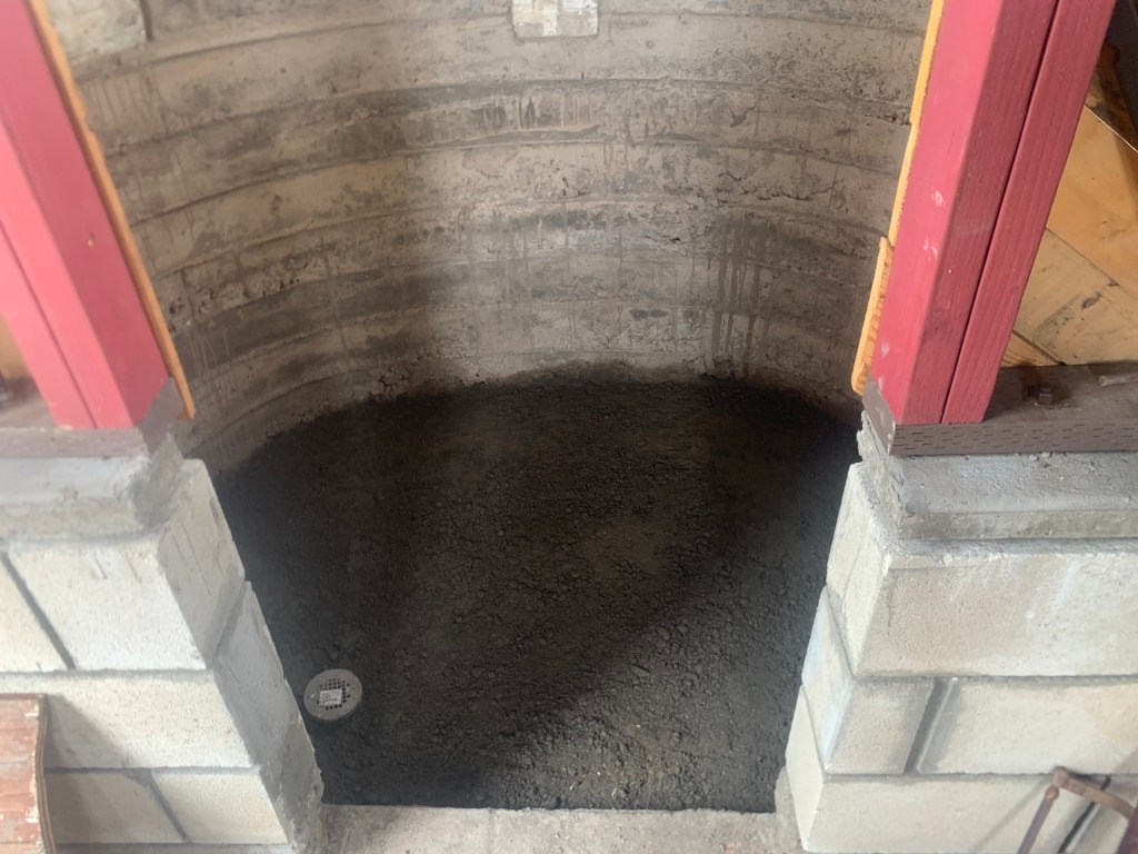 In the shower area, I give the ground some slope toward the drain, and poured a concrete floor. This is the base on which I will install some sort of a finished floor – perhaps tile, perhaps stones, I’m not sure yet.