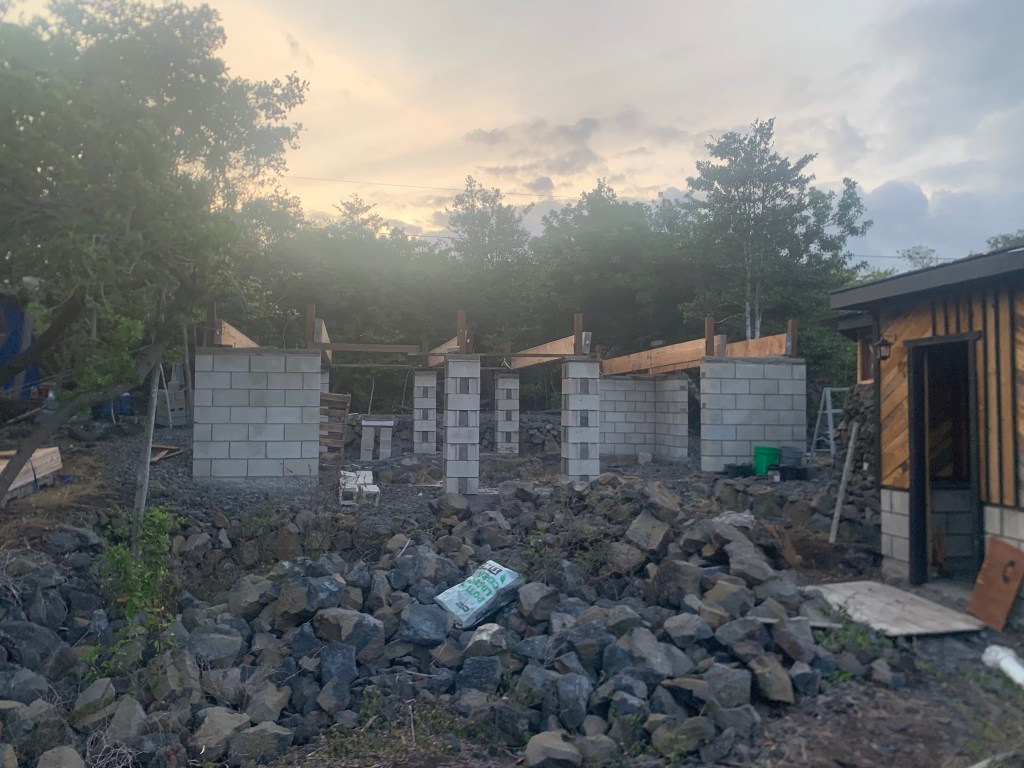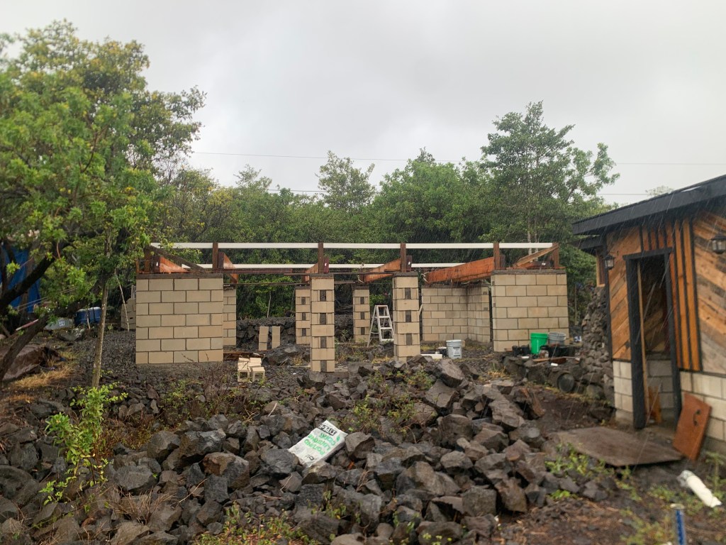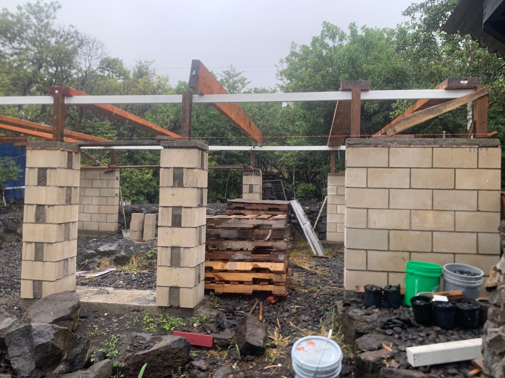 After half a dozen trips, I figured it would be dark before I finished another, so I climbed up on the gazebo roof and fastened the metal roofing down better with some screws I picked up in Hilo the other day,