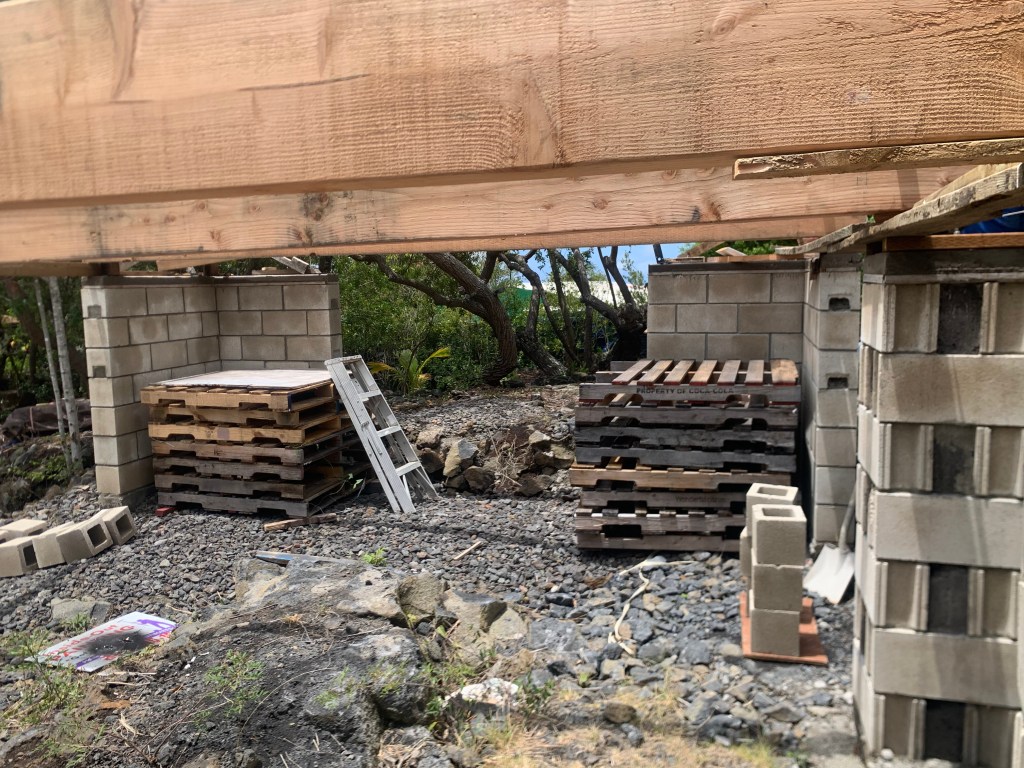 My sitting and thinking has paid off. By using the pallets I have gathered, I create a couple of platforms – scaffolds? – from which I can safely lift the beams into place.