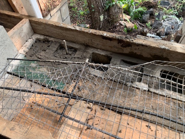 Installed rebar in the form for the concrete conter in the gazebo. Drilled into the columns at the side to anchor the rebar. Added a bit of fencing as the wire mesh reinforcing. Installed support braces under the forms. It is ready to pour.