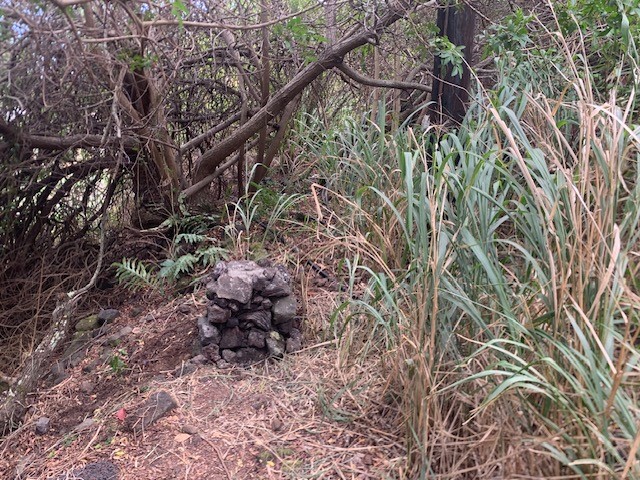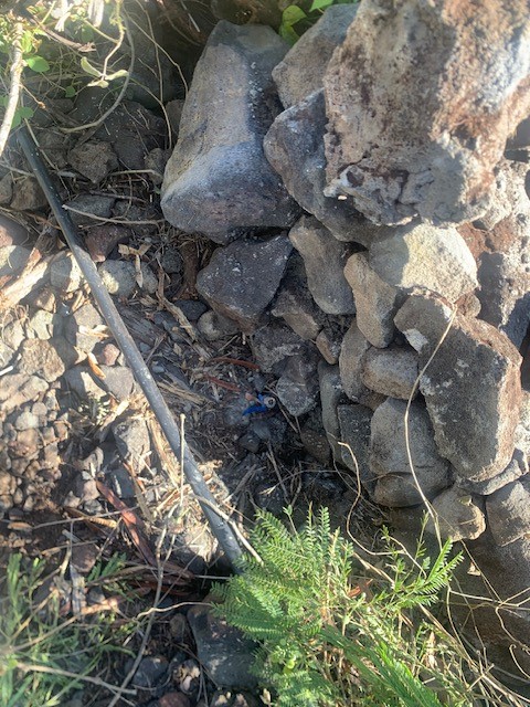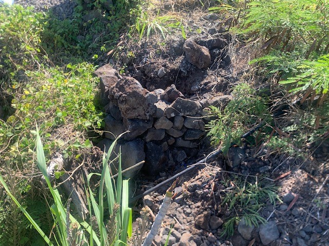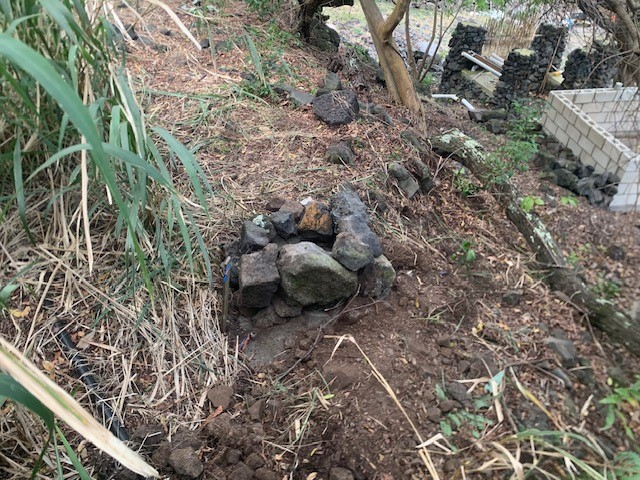 The northeast corner of the two Holowai properties has turned into quite a project. Initially, I was just going to make a square pile of rocks 18″ to 2 foot tall to mark the corner. I have ended up building a double sided rock wall with concete in between, along the front of the property for about twenty feet, and down the side of the property for about thirty! Today I spent time stacking more rocks on the thirty foot section.