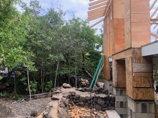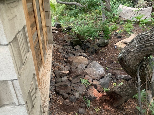 I started to pile up rocks behind the wall of block wall of the bathroom to create a level area. Here, I will place some water containers like barrels, or maybe a water bladder to hold the run off from the roof to be used in the bathroom for flushing the toilet. . . maybe even for the shower, if I add a filter and a pump.