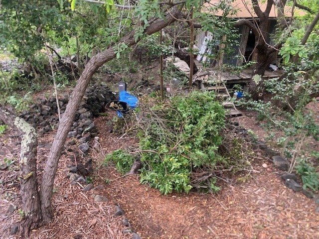 When Alanah was here, she commented on how difficult it was to carry water to the front side yard to water the three coconut palms there. There was a large limb at the edge of the gazebo extension that you needed to manouver around. I removed this limb.