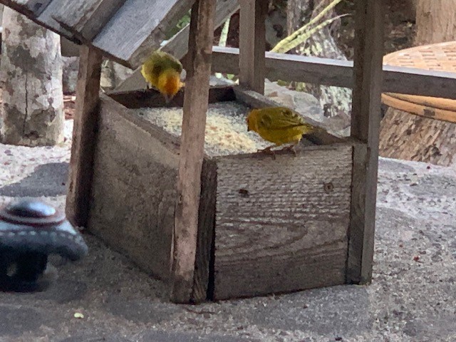 Two yellow birds showed up at the feeder around 11 AM and again around 5 PM. These little birds are not intimidated by the other birds.
