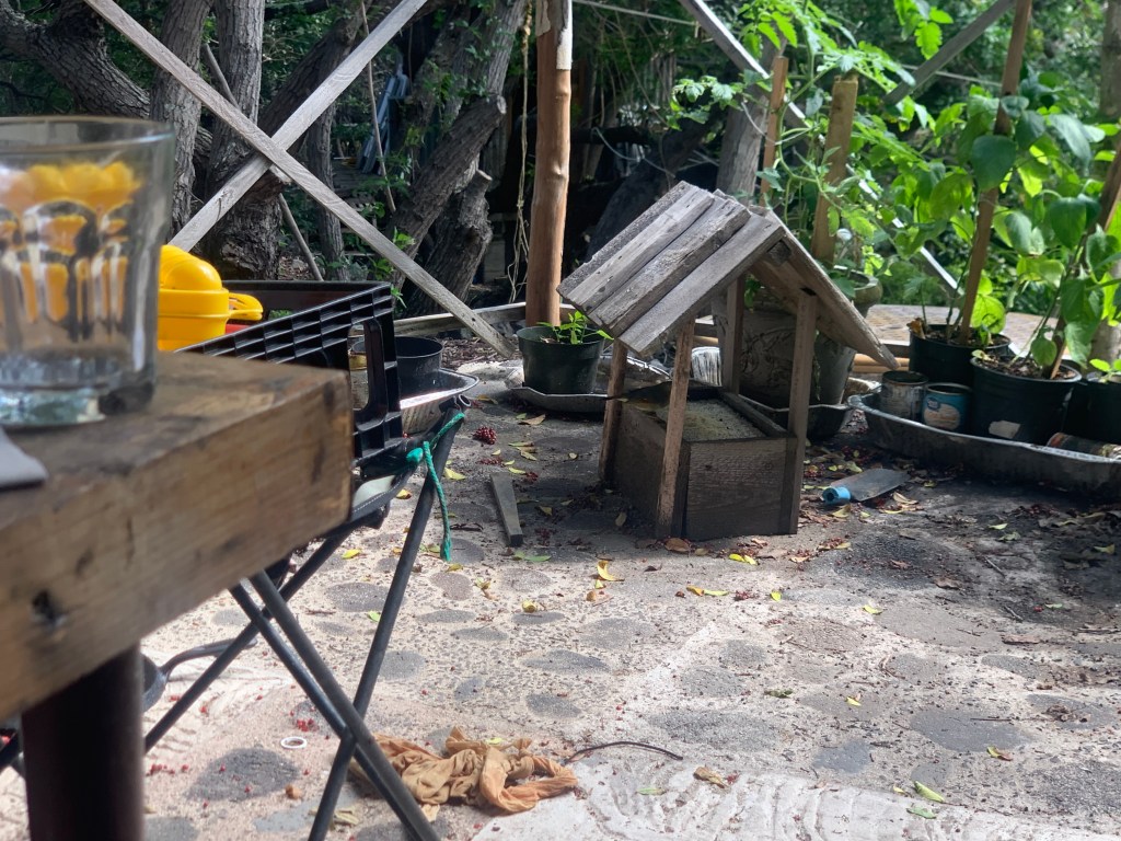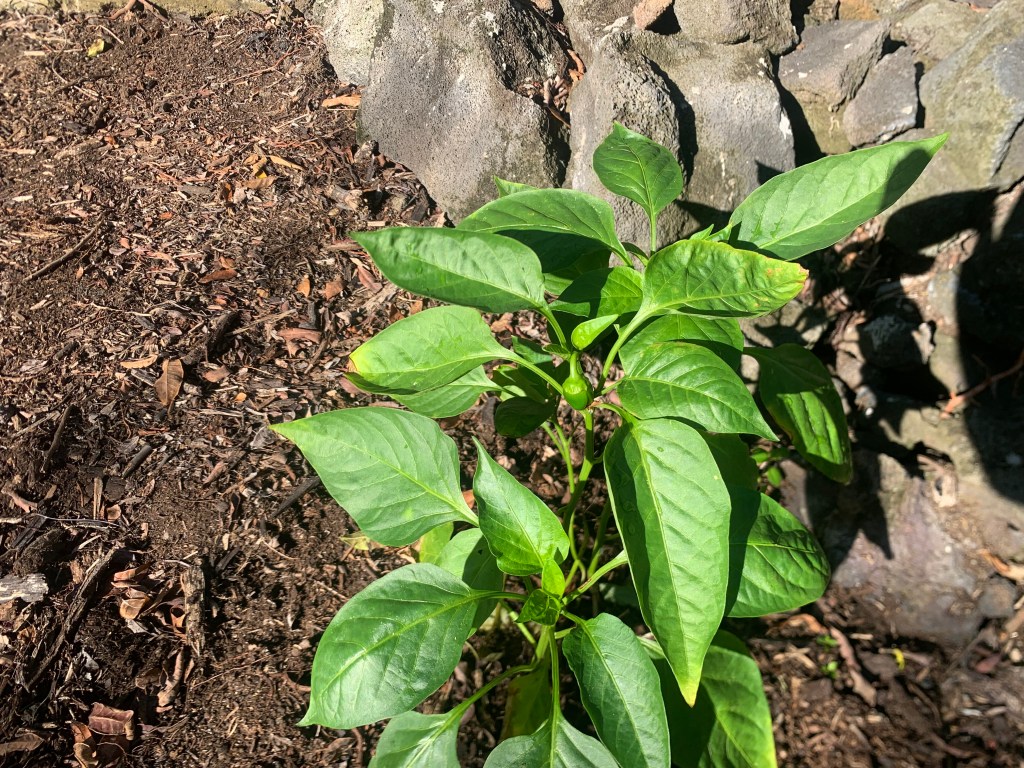 I had planted some of the seeds from the bell peppers I had bought. I planted them into a small flower pot and placed it on the lanai. They had sprouted back in December, the last time I was here, and when I returned, the top of the pot was totally engulfed in pepper plants. I split them up into four different pots to give them room to grow. This has been successful, as there are four or five strong, healthy pepper plants in each pot. One of them has even sprouted a couple of small peppers, so I transplanted them to the garden in front of the fountain.