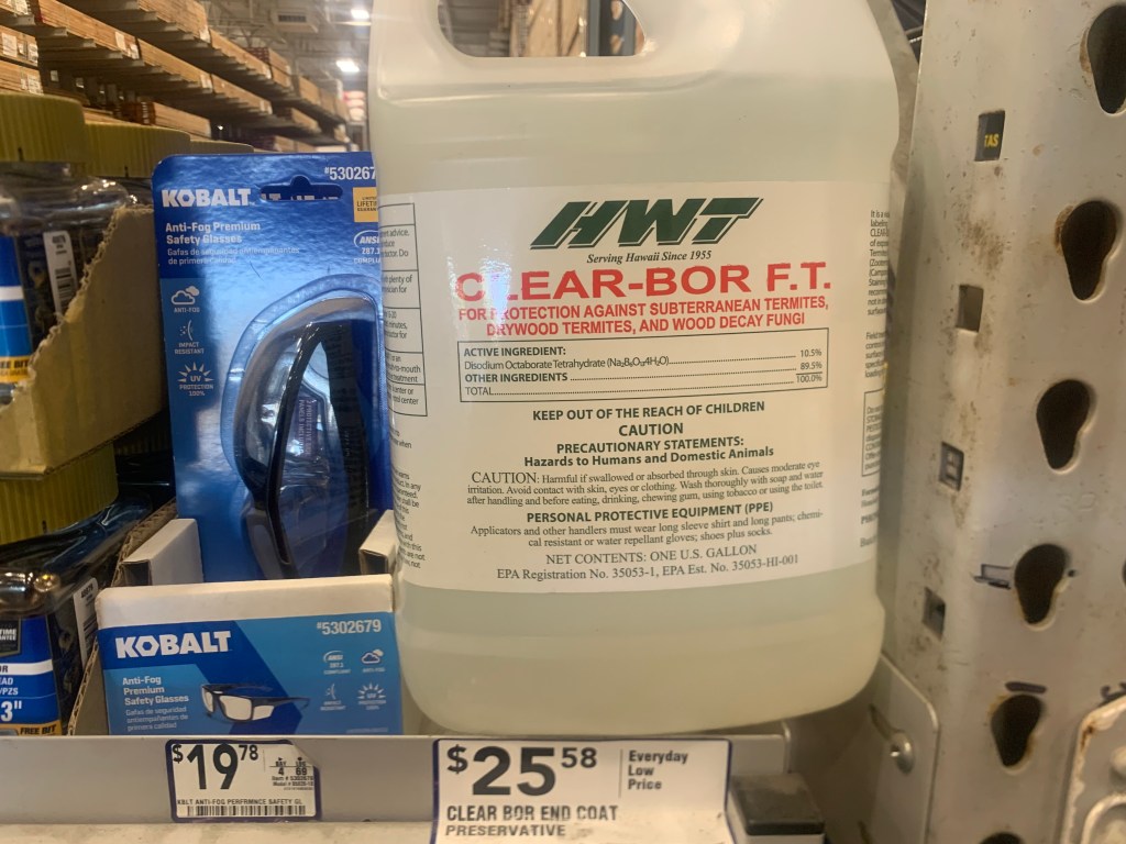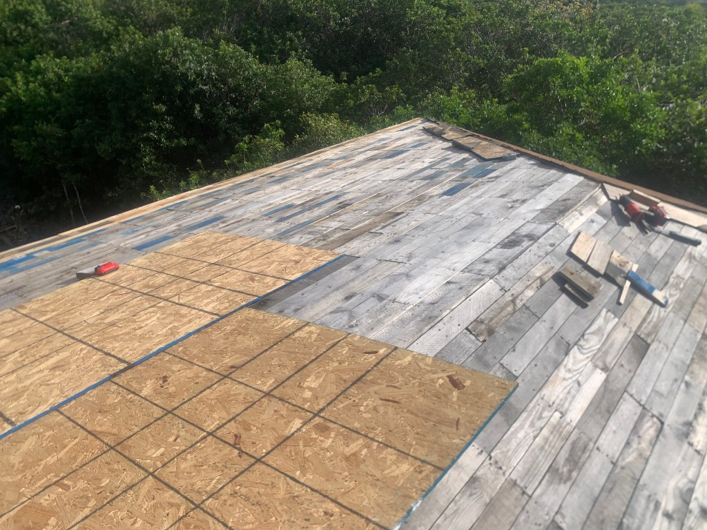 Before installing the OSB plywood, I saturate the salvaged 1x pallet wood with a borate solution to attempt to control the bugs like termites from easting the wood.