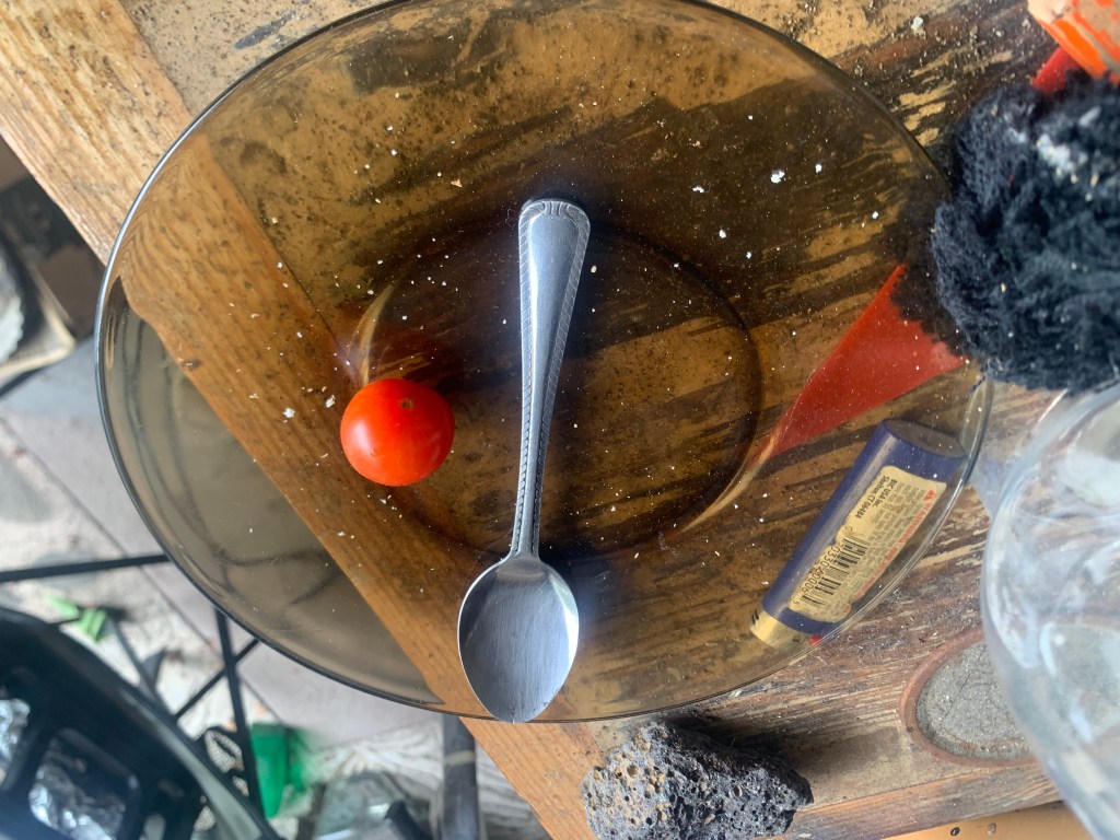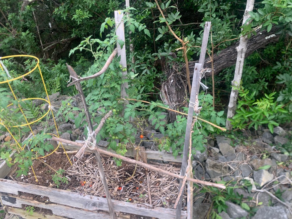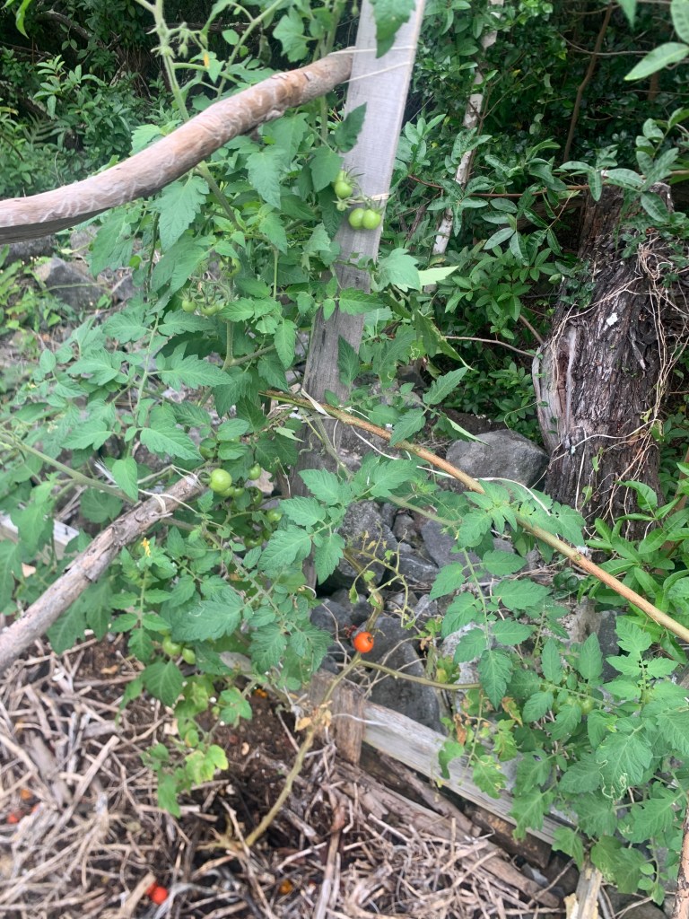 As a rest from pushing plywood up the ladder, I checked out what is left of my tomato plants after being gone for a month.
