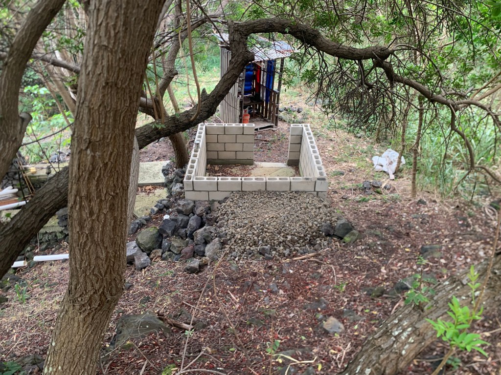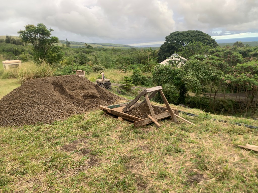 The pile of sand/gravel has been calling to me, so I set up a screed to sift and remove the larger rocks. These have been used to backfill behind the back wall of the bathroom at Ahi. The smaller material with a lot of sand will be used to mix concrete!