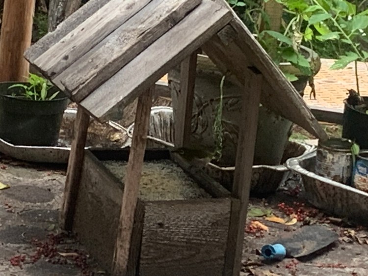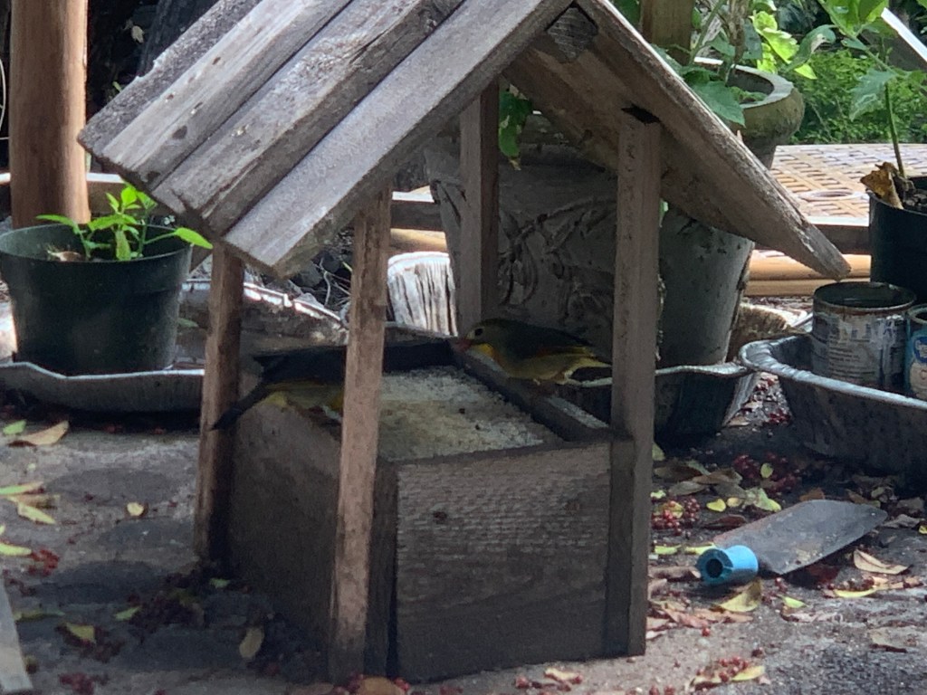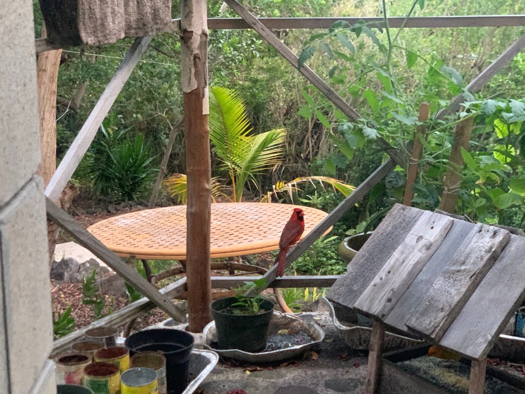 The different types of birds are beginning to make their appearance at the feeder. I’m not sure what kind of bird this is – he is smaller than the red headed cardinals and the green honeycreepers. There are quite a few of them that come and go through the shrubs that form a hedge between the gazebo and the neighbor’s property, but few of them come to the feeder. They do like the fountain/waterfall though!