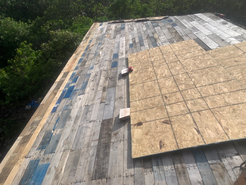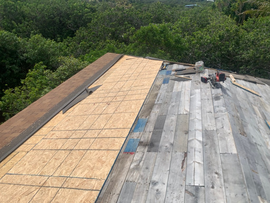After successfully completing the roof 1x boards on this last section of overhang, I find that I cannot install OSB plywood over these two remaining roof slopes. I do not have any OSB plywood. That requires a trip to Kona!