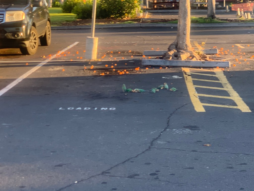 And another surprise is waiting for me in the parking lot of the lumber yard, where I spot a flock of peach faced love birds – a species of birds that is definitely not “native” to Hawaii! Over a dozen of them that have escaped from someone’s aviary!