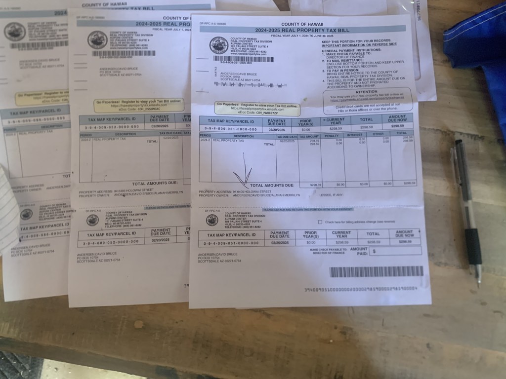 So, I gather my past property tax bills, and the current vehicle registration. The tax bills might not be acceptable because they need to be within the last 60 days, and these are from October – over 90 days ago, and the new ones do not come out for another 30 days! Bureacracy exists everywhere!