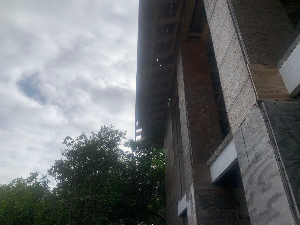 Anyway, I feel that I have to have something to show for each day – some kind of an accomplishment. So, I look around the site and see the last corner of the roof overhang that needs the 1 x boards finished. Once I have this corner completed, a matter of only three or four boards, I can move on to installing the OSB plywood over the two long slopes.