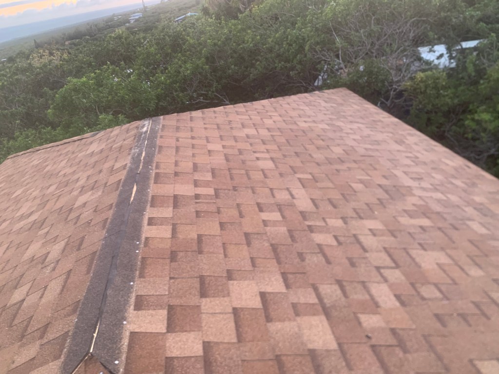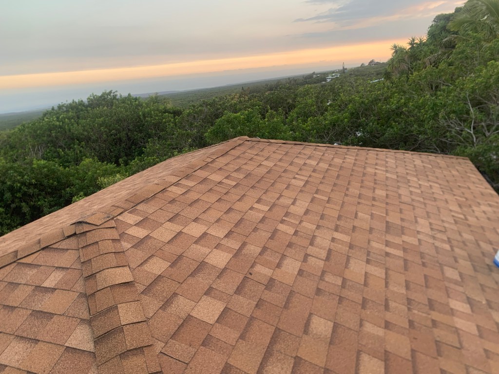 Let it rain all it wants to. The roof is shingled. The main shingles are all on, and now it is just a matter of installing the caps – over the four hips and the center ridge!