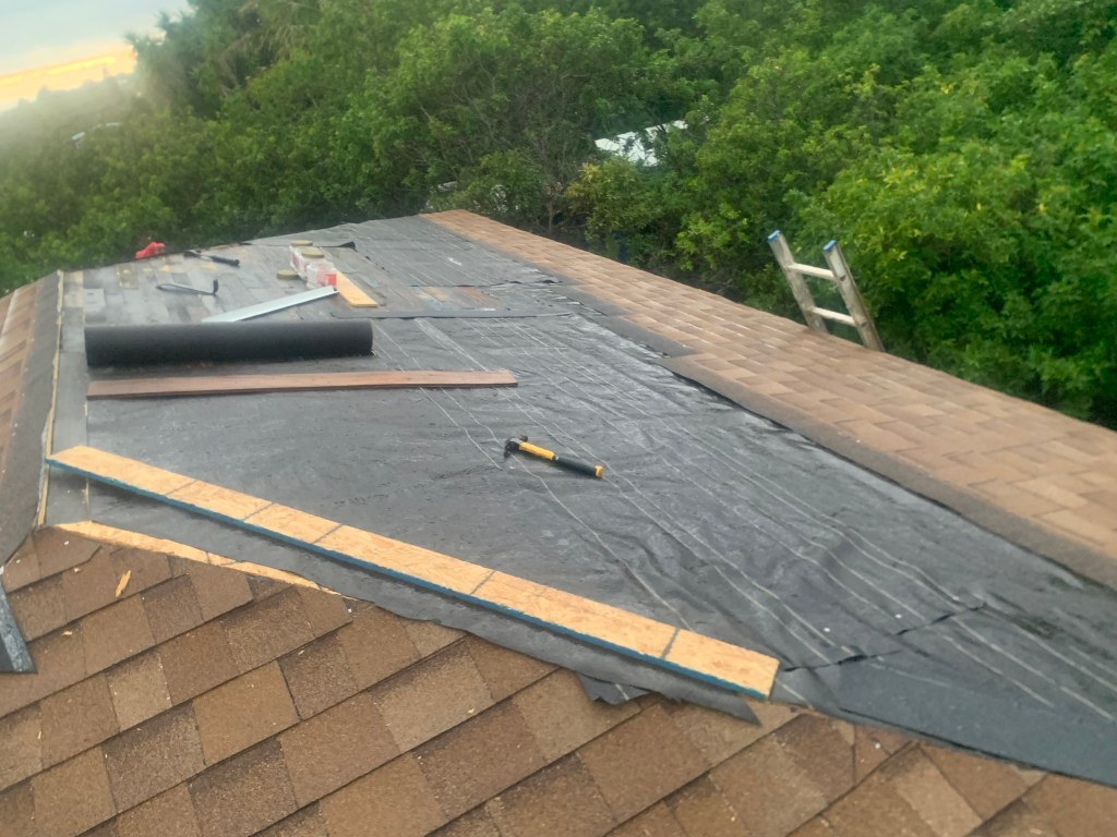 Between rainstorms, I got back to work on the roof shingling. Like the OSB plywood, the bundles of shingles are a chore to get up on the roof. I throw a bundle of shingles over my shoulder and slowly climb the ladder. Sometimes, I only take a half a bundle at a time – whatever works!