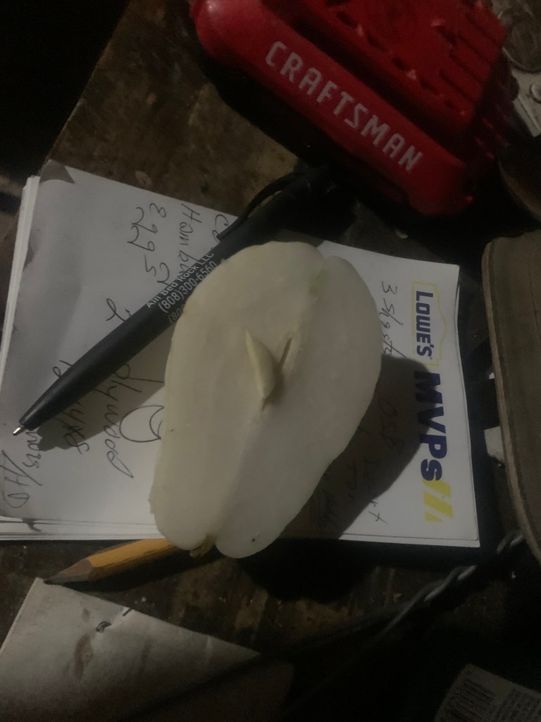 It has the outside texture of a squash, but when you cut it open, it looks like, well, it looks like a pear!