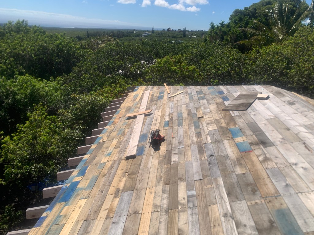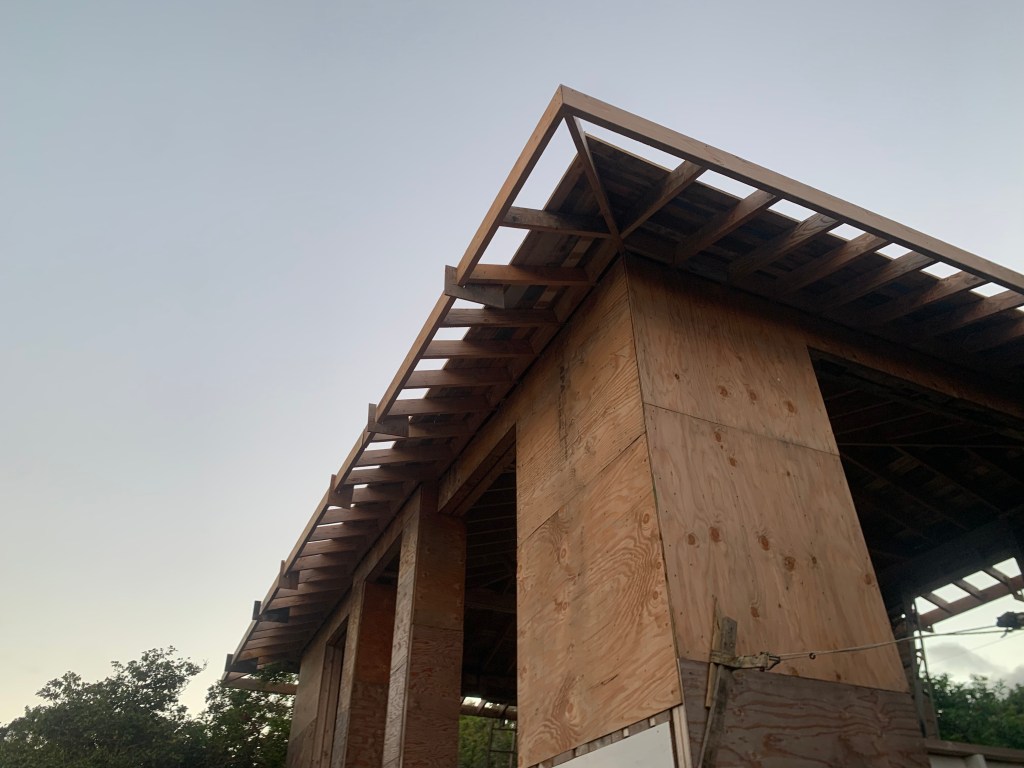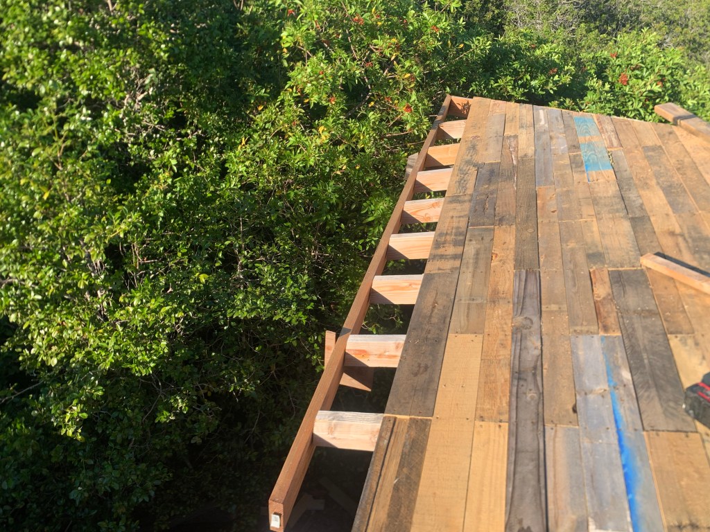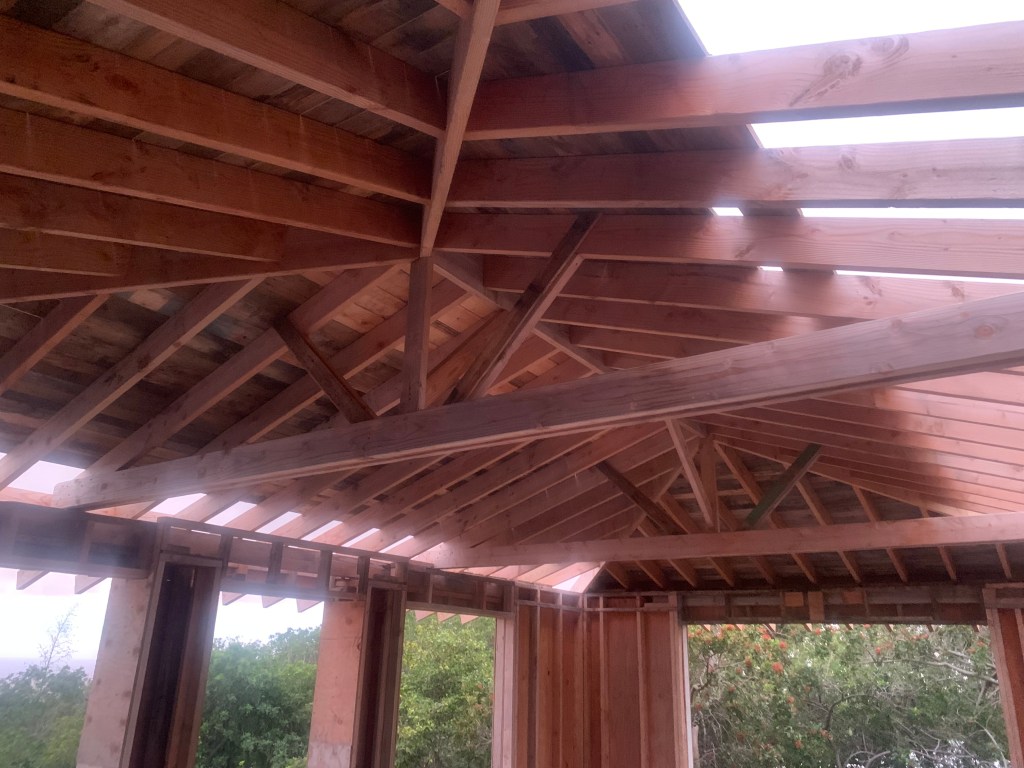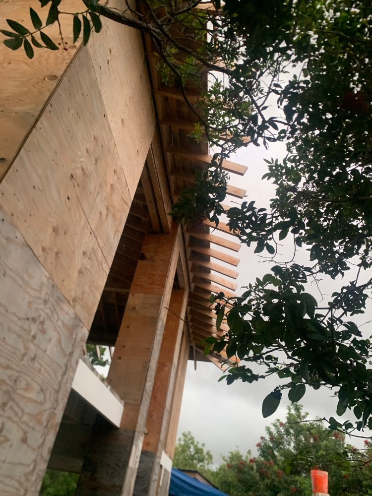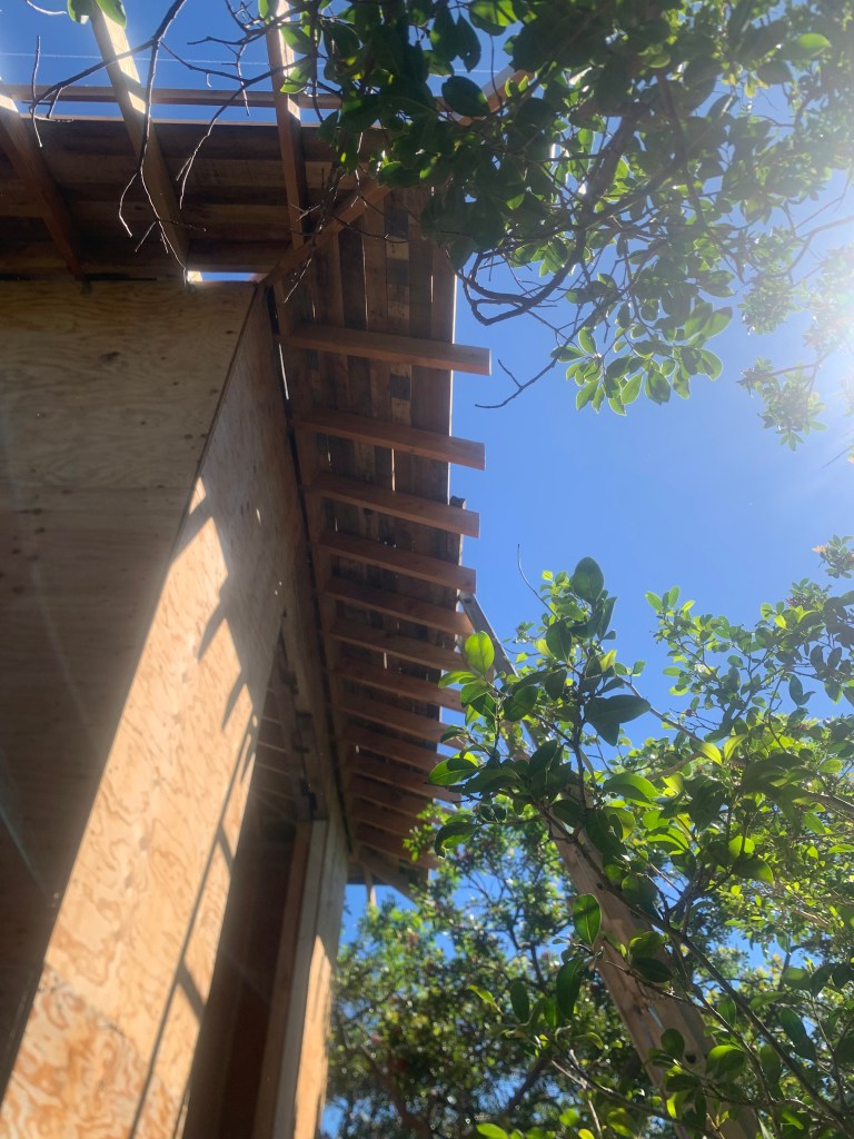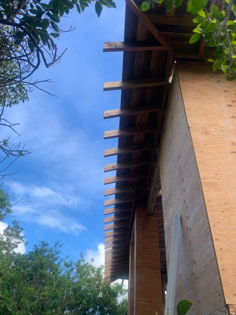 The overhang on the makai side ( the side towards the ocean) is ready for me to cut the rafter tails all the correct angle for installing the fascia! They are all the original square cut and need to be a plumb cut so that the fascia is not on an angle! Also, they are not the same distance out from the wall and need to be so the fascia is straight up and down! This will make it easier to install gutters.