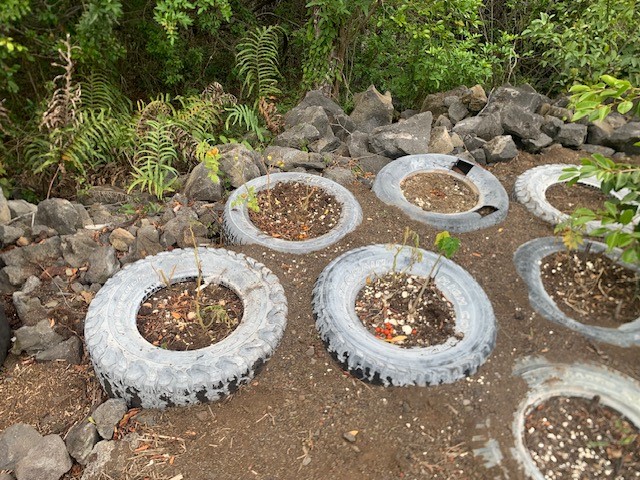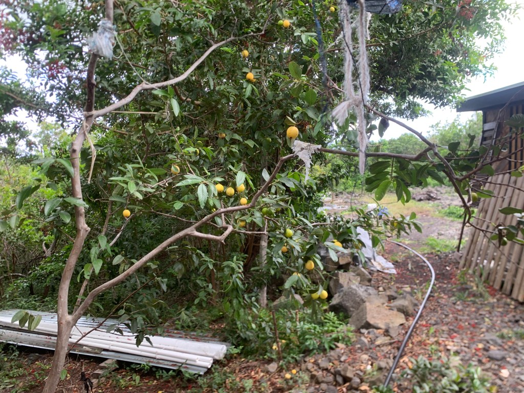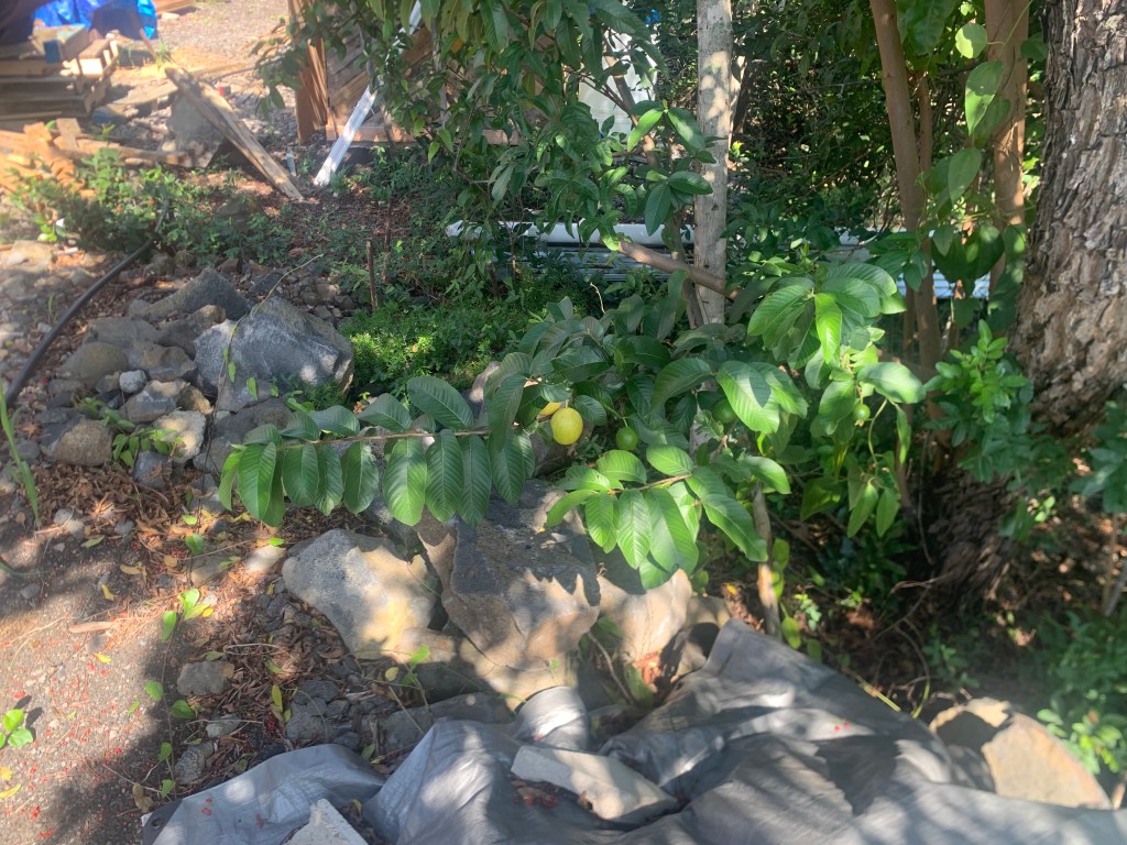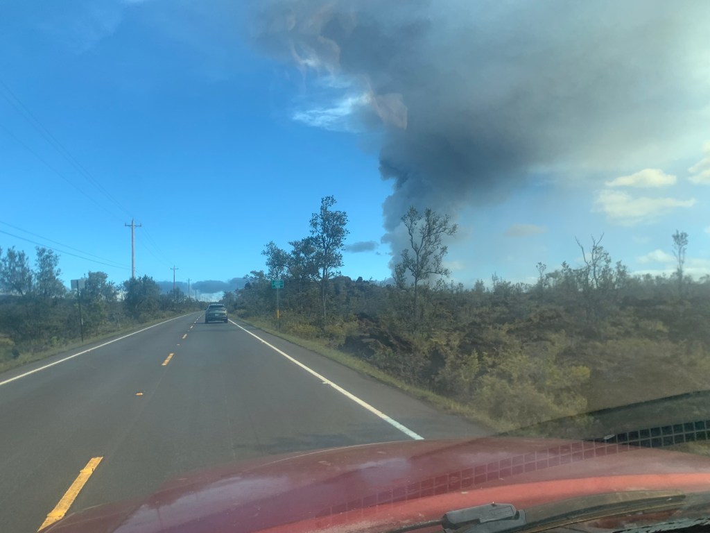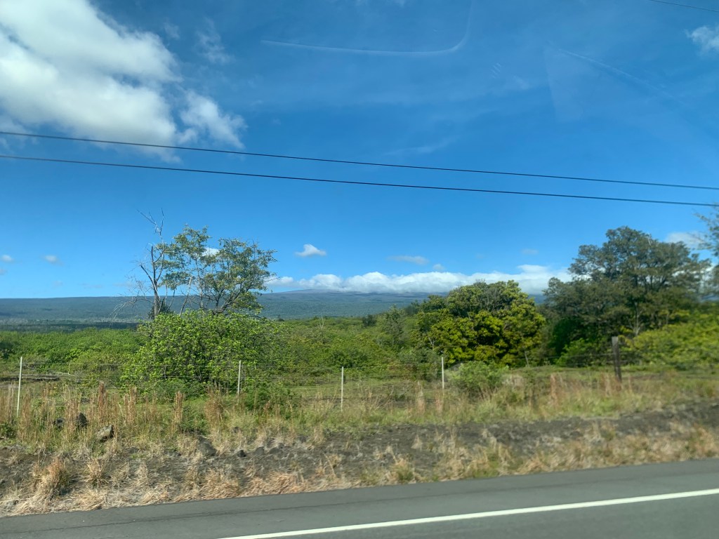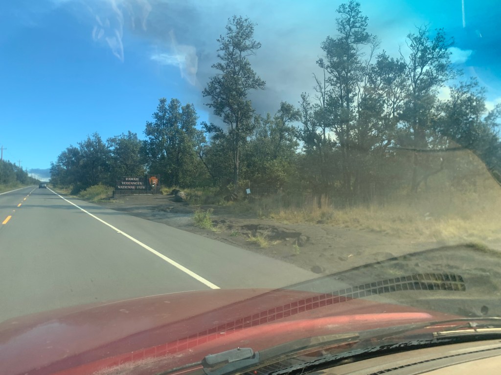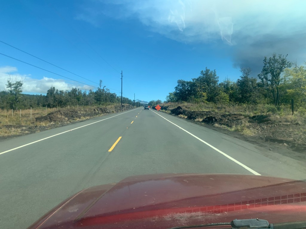 As the road goes on past the mac nut orchards, the landscape becomes more sparse and rocky, There are lots of ʻōhiʻa lehua trees- a native tree that only grows here. (or so they say) Along the road, there are lots of guava trees/bushes. I get my first real view of the smoke from the volcano eruption.