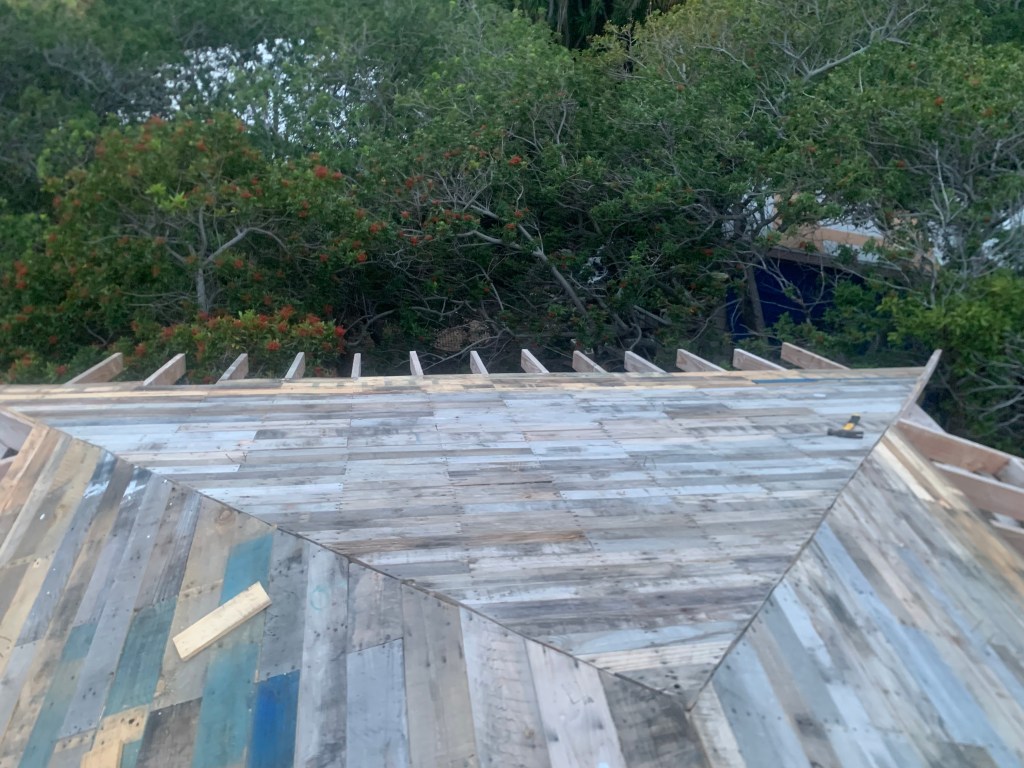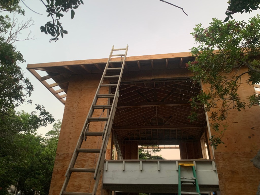 With the fascia on, I can finish the 1 x boards. The next step is to install 1/2″ OSB plywood over these boards. This will provide lateral support to the roof to resist the force of the wind!