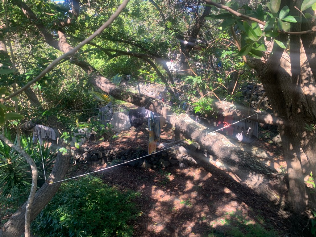 The wet clothes sat in the back seat of the truck until this morning when I hung them out to dry on some ropes strung up between the trees!